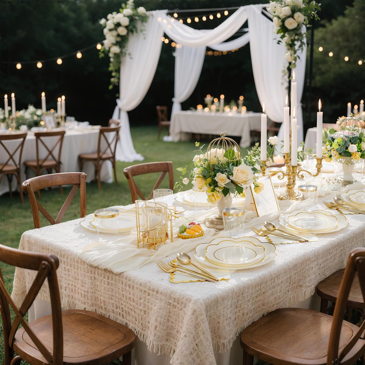 WONDERFUL 350PCS Ivory Plastic Plates for Party Plates Disposable Heavy Duty Ivory Gold Plastic Dinnerware Set for 50 Guests - 100 Disposable Plate,150 Silverware,50 Cup,50 Wedding Napkins for Wedding