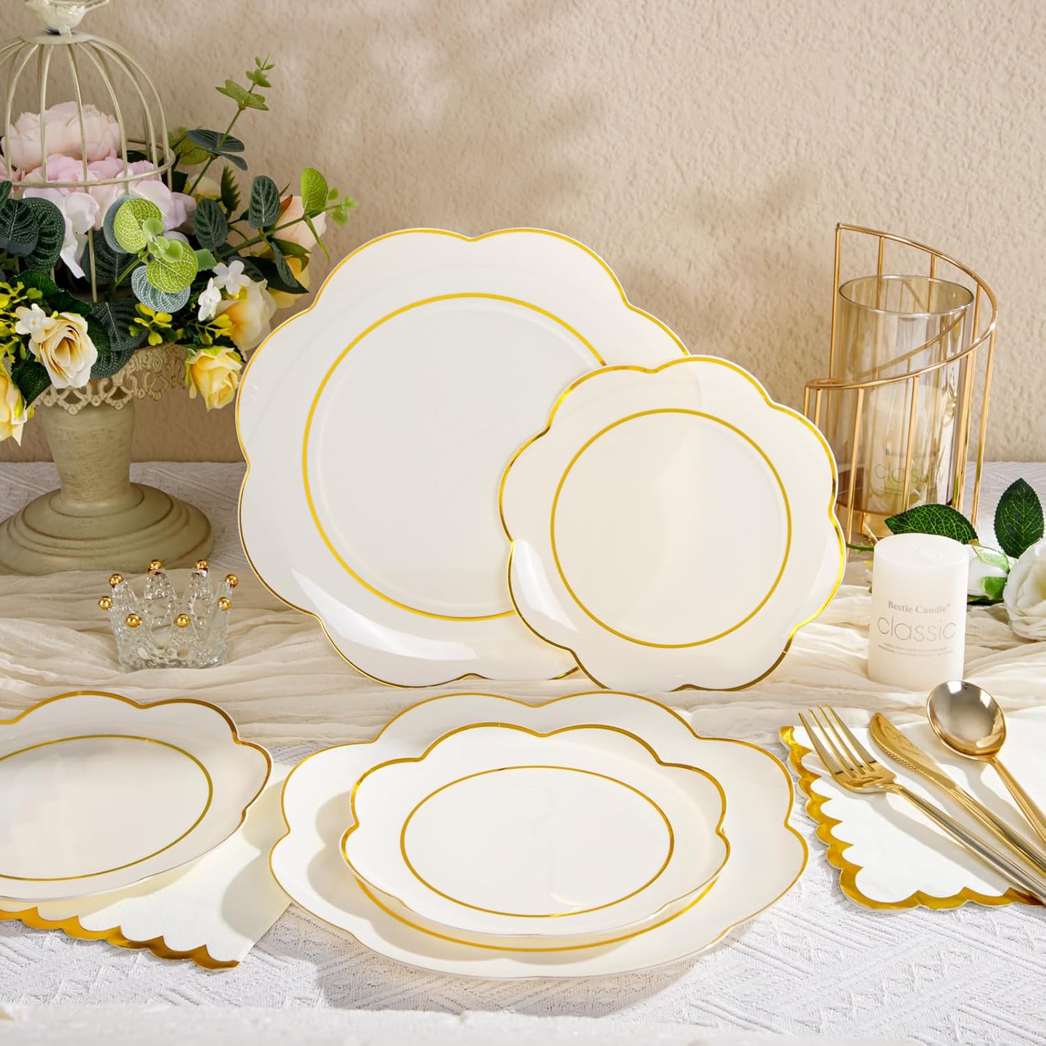 • VERSATILE FOR EVERY OCCASION:From formal weddings and corporate luncheons to casual BBQs,birthdays,and picnics,these plastic plates disposable elevate any setting.Their elegant beige base with gold accents complements any theme,while the complete 50-piece set ensures high quality service for family reunions,holiday feasts,graduations,and more.