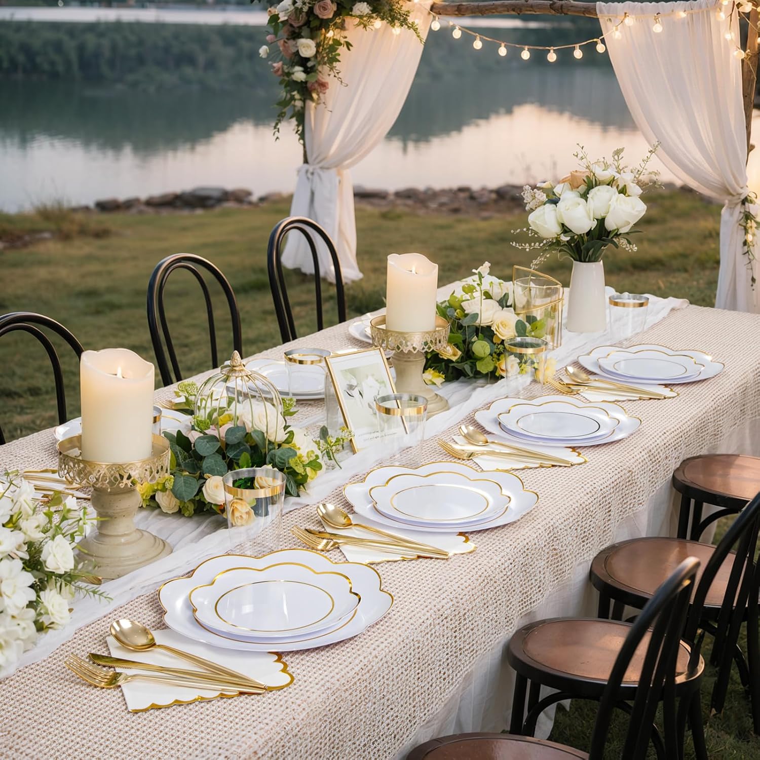 • UPSCALE 50-GUEST VALUE PACK​:Perfectly curated for gatherings of 50,this all-inclusive party plates set include 50 dinner plates,50 dessert plates,50 knives,forks,spoons,cups,and 50 premium wedding napkins.The elegant gold-rimmed design adds a touch of sophistication,making it an ideal choice for weddings,anniversaries,or any upscale event where style meets functionality.