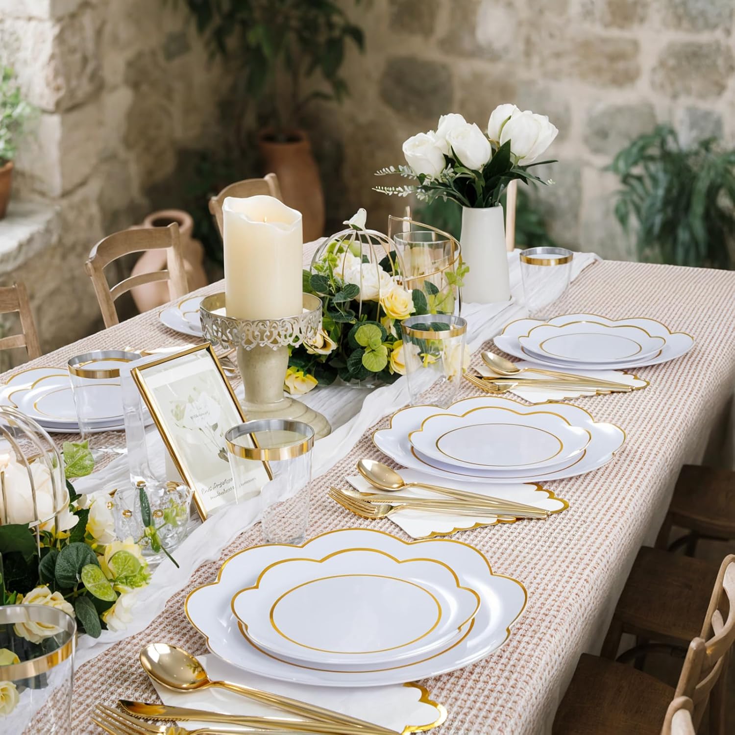 • VERSATILE FOR EVERY OCCASION:From formal weddings and corporate luncheons to casual BBQs,birthdays,and picnics,these plastic plates disposable elevate any setting.Their elegant white base with gold accents complements any theme,while the complete 50-piece set ensures high quality service for family reunions,holiday feasts,graduations,and more.