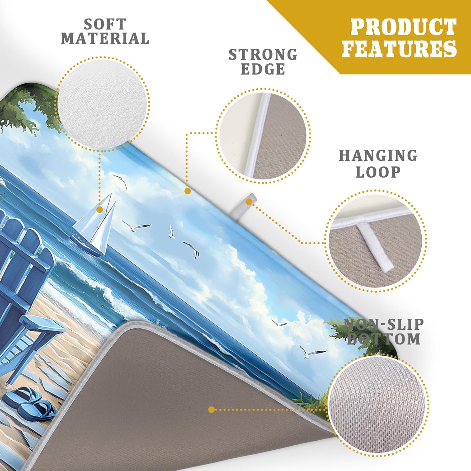 • 【Premium Material】The sea beach kitchen mat is made of high-quality polyester surface material, and the middle is composite sponge material, provides a soft protective cushion. The backing with reversible superfine fiber can absorb water several times heavier than itself, which quickly absorbs water, stops liquids from soaking through, keep the kitchen countertop dry and clean. The dish drying mat can been double-sided uses with strong edging, not easy to disperse.