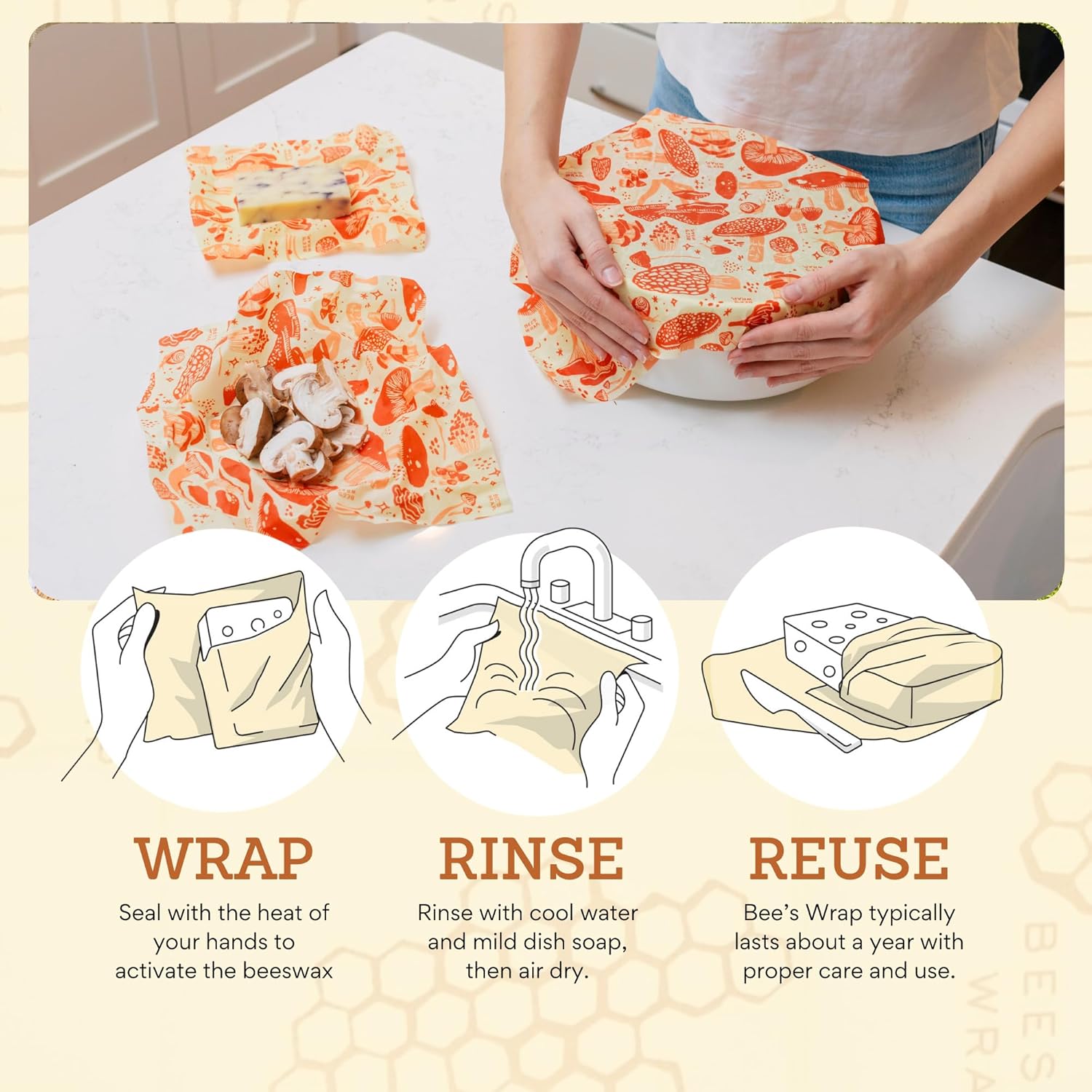 • BEESWAX WRAP is simple to use: warm with your hands to create a moldable, self-adhering seal that keeps food fresh. Hand wash with cool water and mild soap, air dry, and reuse for up to a year with proper care. Bee's Wrap can be composted or used as a fire starter; true zero waste living.