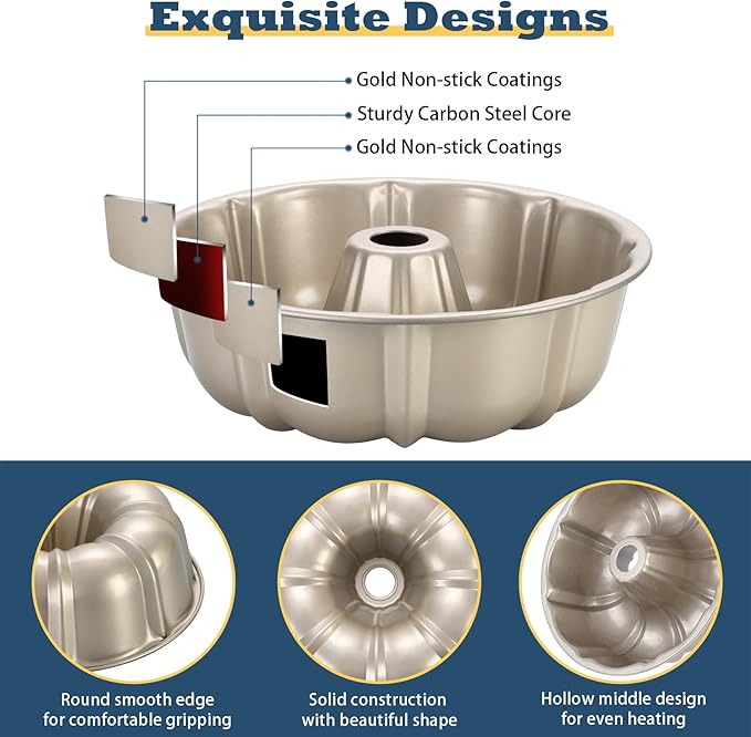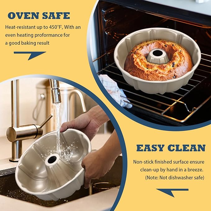 • 【Non-Stick, Easy Clean】Fluted tube pan’s interior and exterior are covered with healthy non-stick gold coatings, Cakes would be come out nicely without leftover residue, No food sticking to anywhere during long baking and will resist your cake burning, Always make cleaning in a breeze, Just use soft cloth to wash the pan under warm soapy water, But please do not use steel wool to avoid scratching the non-stick surface, Hand-wash recommended