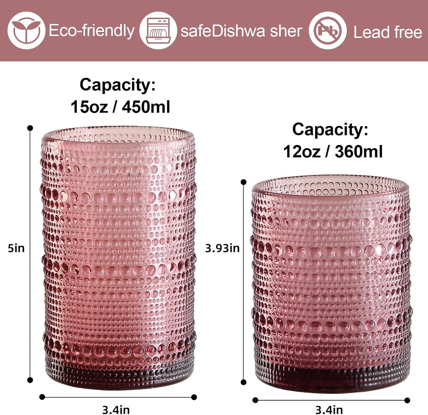 Vintage Hobnail Drinking Glasses Set of 8,Purple 12 oz & 15oz Highball Glass Cups, Kitchen Drinkware Glassware,Embossed Water Tumbler,for Beer,Cocktail,Whiskey,Juice and Various Mixed Drinks