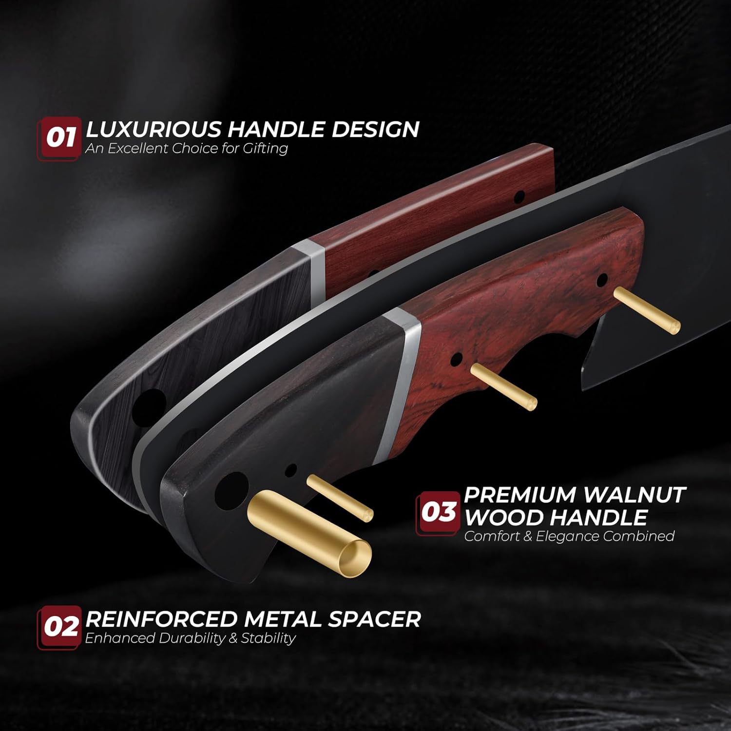 • Ergonomic Walnut Handle – Designed for Comfort & Control.Combining natural elegance with superior ergonomics, the hand-polished walnut wood handle features a sculpted finger groove for a secure, fatigue-free grip. Reinforced with a metal spacer and full-tang structure, it offers balance, durability, and long-term comfort. Whether you're slicing or chopping, this handle provides the control professionals demand with the style you’ll love.