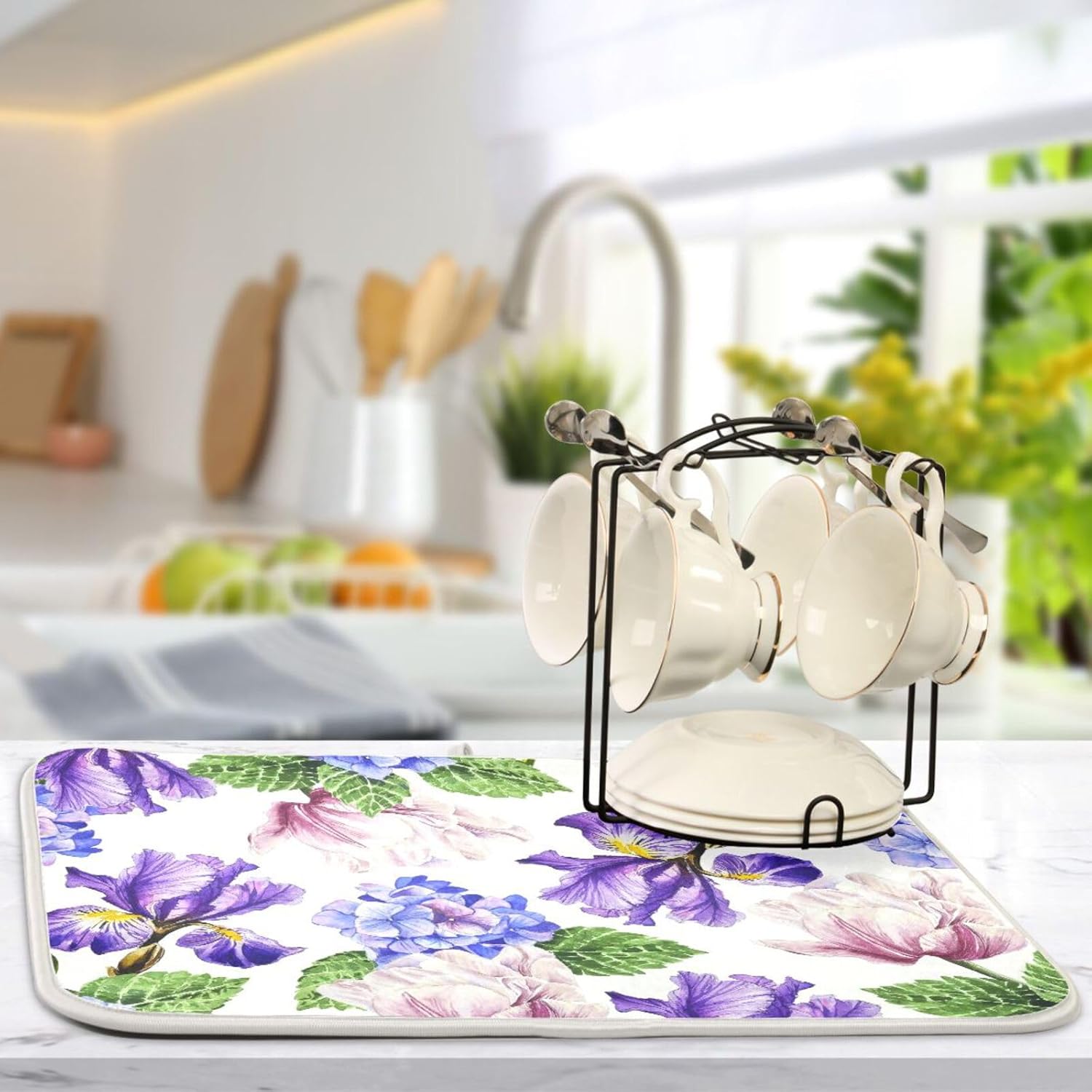 Watercolor Flowers and Hydrangeas Dish Drying Mat Super Absorbent Drying Mat 18x24 inch Large Dish Drying Mats for Kitchen Counter Dish Drying Pads Kitchen Drying Matt for Countertop