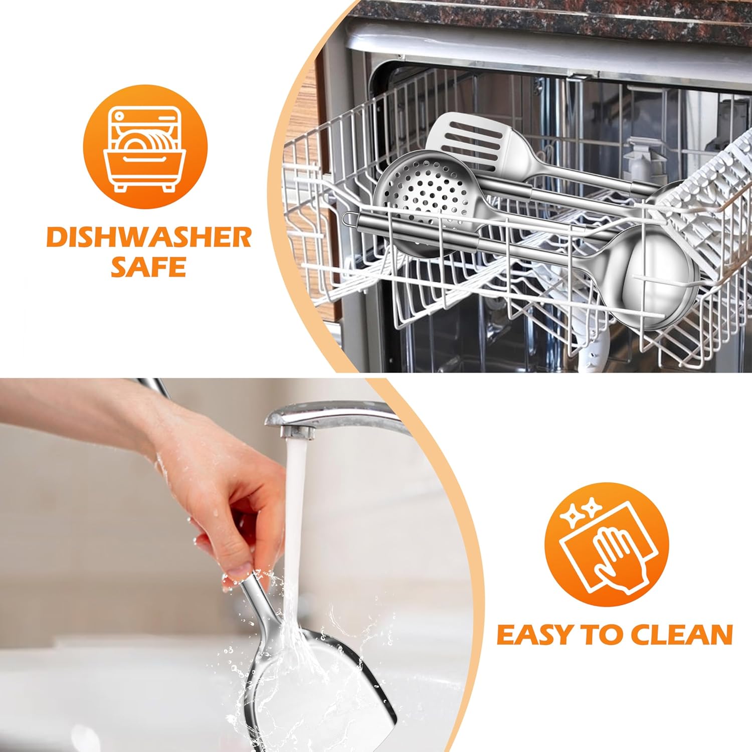 • EASY TO CLEAN & DISHWASHER SAFE: Stainless steel kitchenware has a smooth surface and is easy to clean by hand with soap or warm water, Dishwasher safe to make cleaning easier and make cooking more convenient (Tip: Do not clean and rub the utensil with hard materials to keep it shiny)