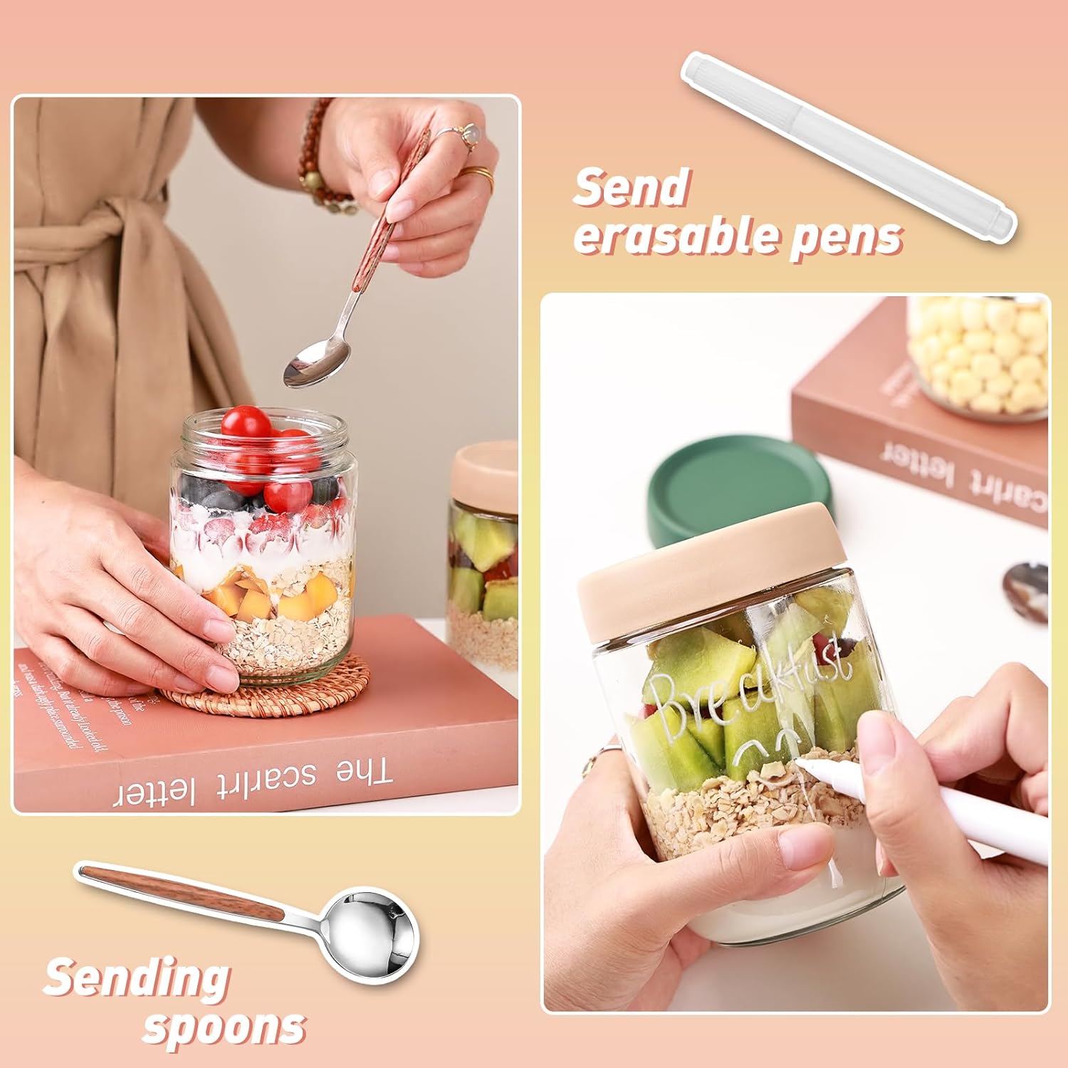 • Overnight Oats Containers Set of 8 Includes: This comprehensive set features 8 containers in both large (16oz) and small (10oz) sizes, 2 pcs spoon, perfect for meal prepping your favorite overnight oats, chia seed pudding, or salads.