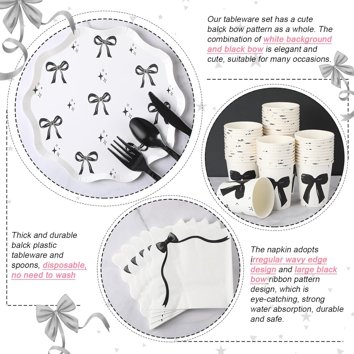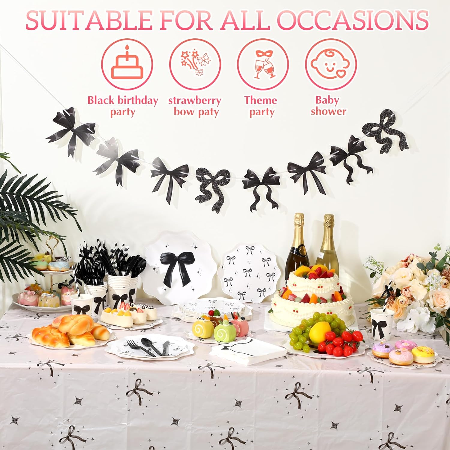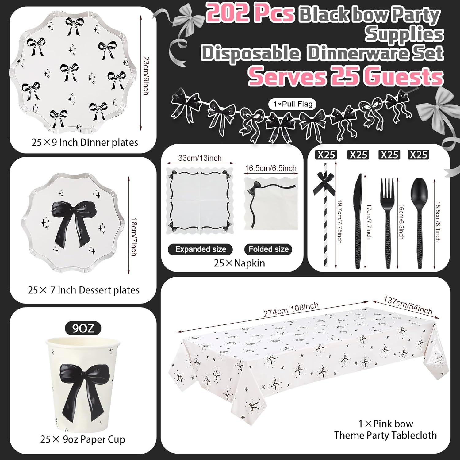 Sawysine 202 Pcs Black Bow Party Supplies Disposable Dinnerware Set 50 Plates 25 Cups 25 Napkins 25 Plastic Forks 25 Knives 25 Spoons 25 Straw Flag Tablecloth to Serve 25 Guests
