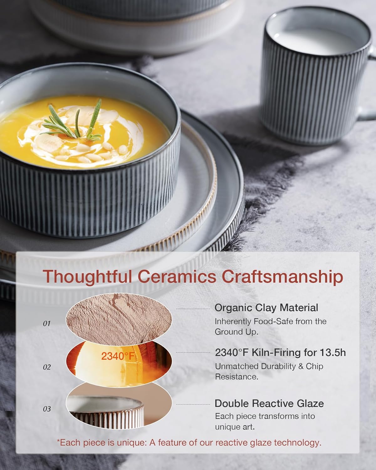 • [Stackable]: We are truly captivated by the design featuring vertical ribbed edges, but we also recognize the importance of optimal stacking. To address this, we have incorporated precision grooves at the base of this dish set, ensuring smooth and secure stacking