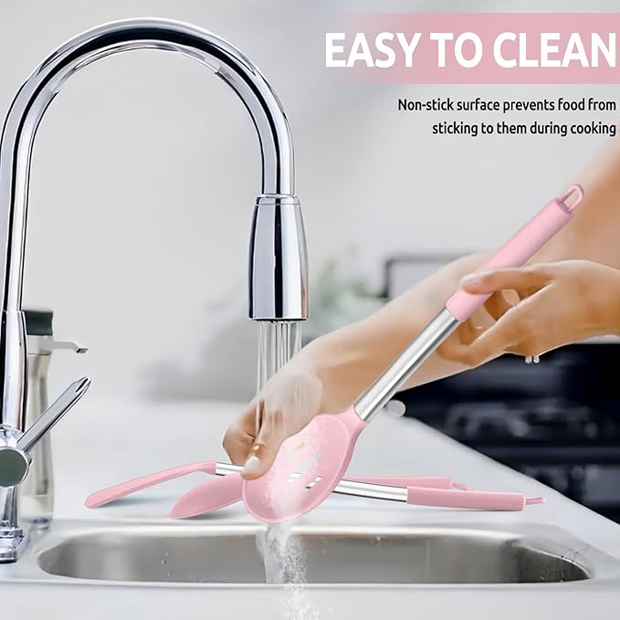 • EASY TO CLEAN & STORE - Non-stick silicone surfaces make food harder to stick to during cooking compared to wooden utensils, Easy to clean by hand and dishwasher safe, Hanging loop attached to the handle for easy storage, Keep your drawer space clear of clutter, Ideal gift for Christmas, Thanksgiving, housewarming