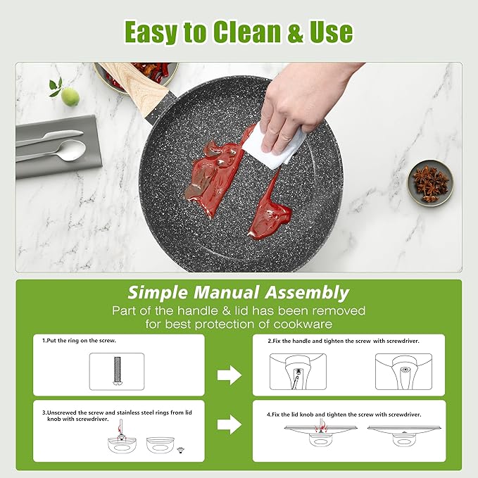 • Easy to Clean & Use: Recommend to hand wash the cookware after each meal as it cleans effortlessly. Simply wipe with a paper towel or rinse with water. In addition, some of the handles and lids have been removed to better protect the cookware, so you need to simple manual assembly, please refer to the instructions for details.