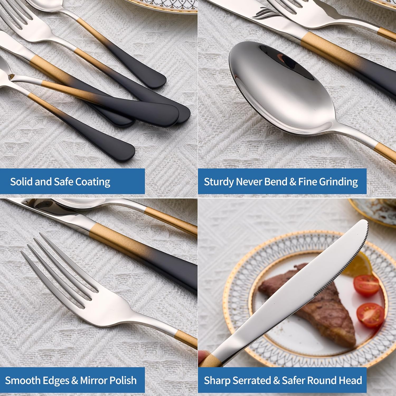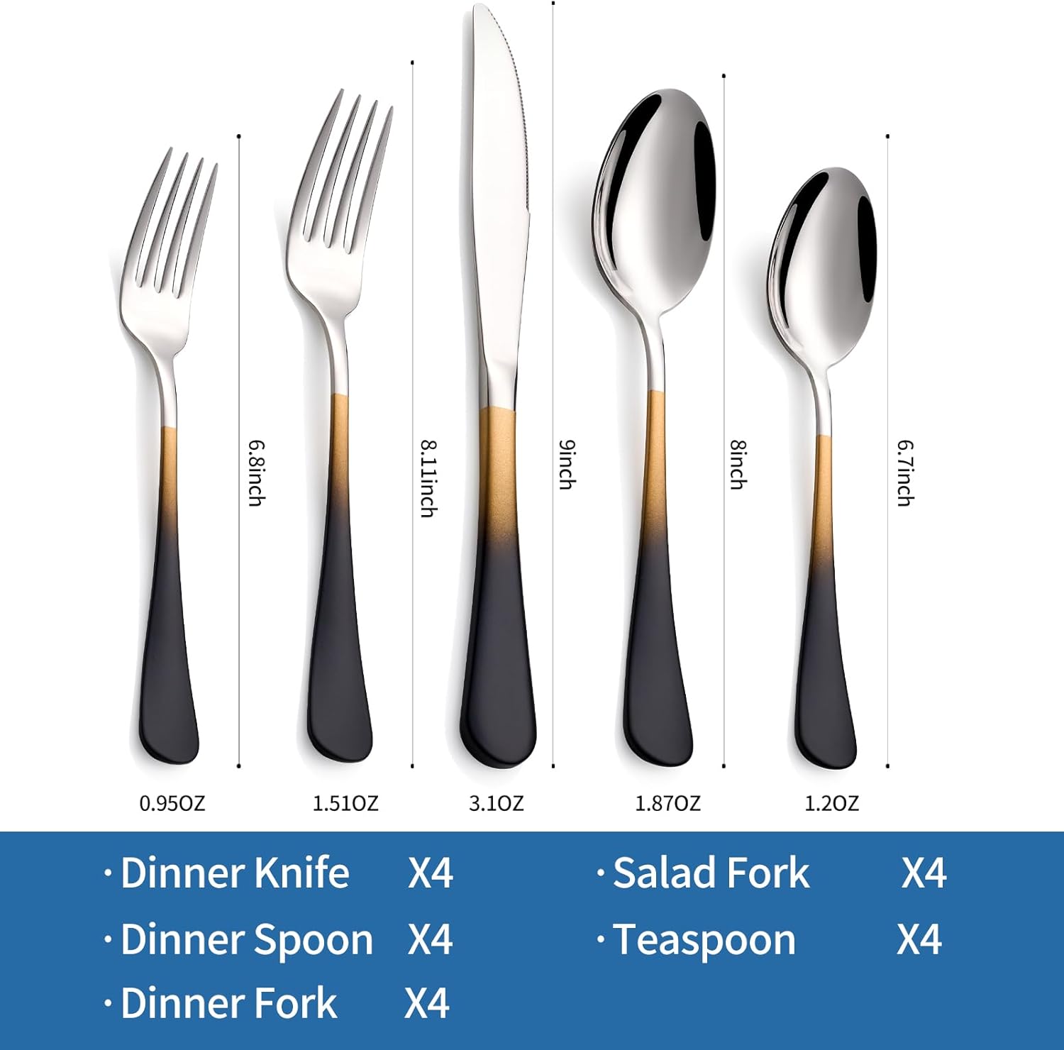 20-Piece Black Gold and Silverware Set, 18/0 Stainless Steel Colorful Handle Flatware Set,Service for 4,Modern Cutlery Set Includes Dinner Knives Forks Spoons,Mirror Polished,Dishwasher Safe