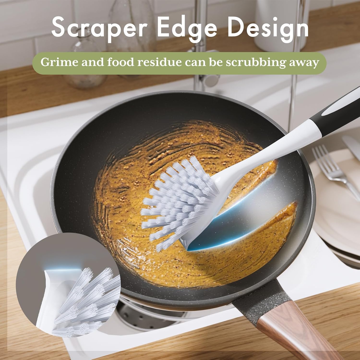 • Scraper edge design: Kitchen brushes have a handy scraper built onto the front that is quite sturdy and helpful, dish scrubber with scraper easily removes stuck-on food or tough stains on sink.