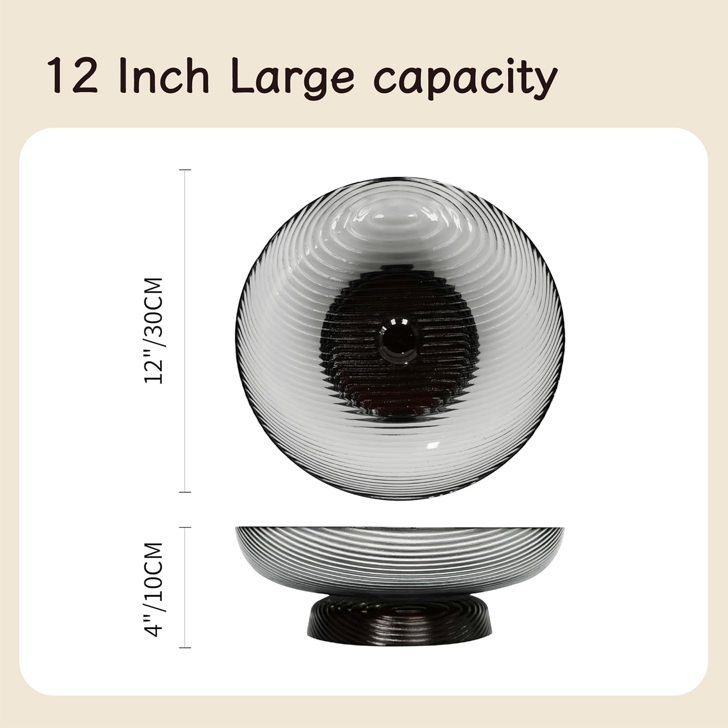 12-Inch Ribbed Glass Serving Bowl with Pedestal, Large Decorative Fruit Bowl, 2.5-Quart Capacity (Smoke Grey)