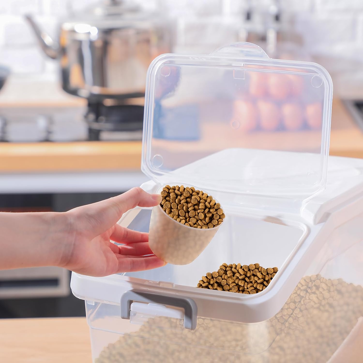 Sunnyray 4 Pcs Rice Storage Container 22 lb Airtight Flour Container with Wheels Measuring Cup Clear Pet Food Cube Dog Cat Birds Food Bin Grain Cereal Organizer Box for Dry Baking Supplies(White Lid)
