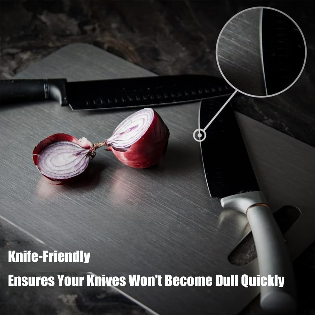 • 【Healthier and Safer】Our cutting boards are made of 100% pure titanium, which is a trusted material for surgical implants. Unlike wooden and plastic cutting boards, pure titanium cutting board do not absorb liquids, and are easy to clean,do not leave any odors or subtle food residues, making them a healthy choice for your kitchen