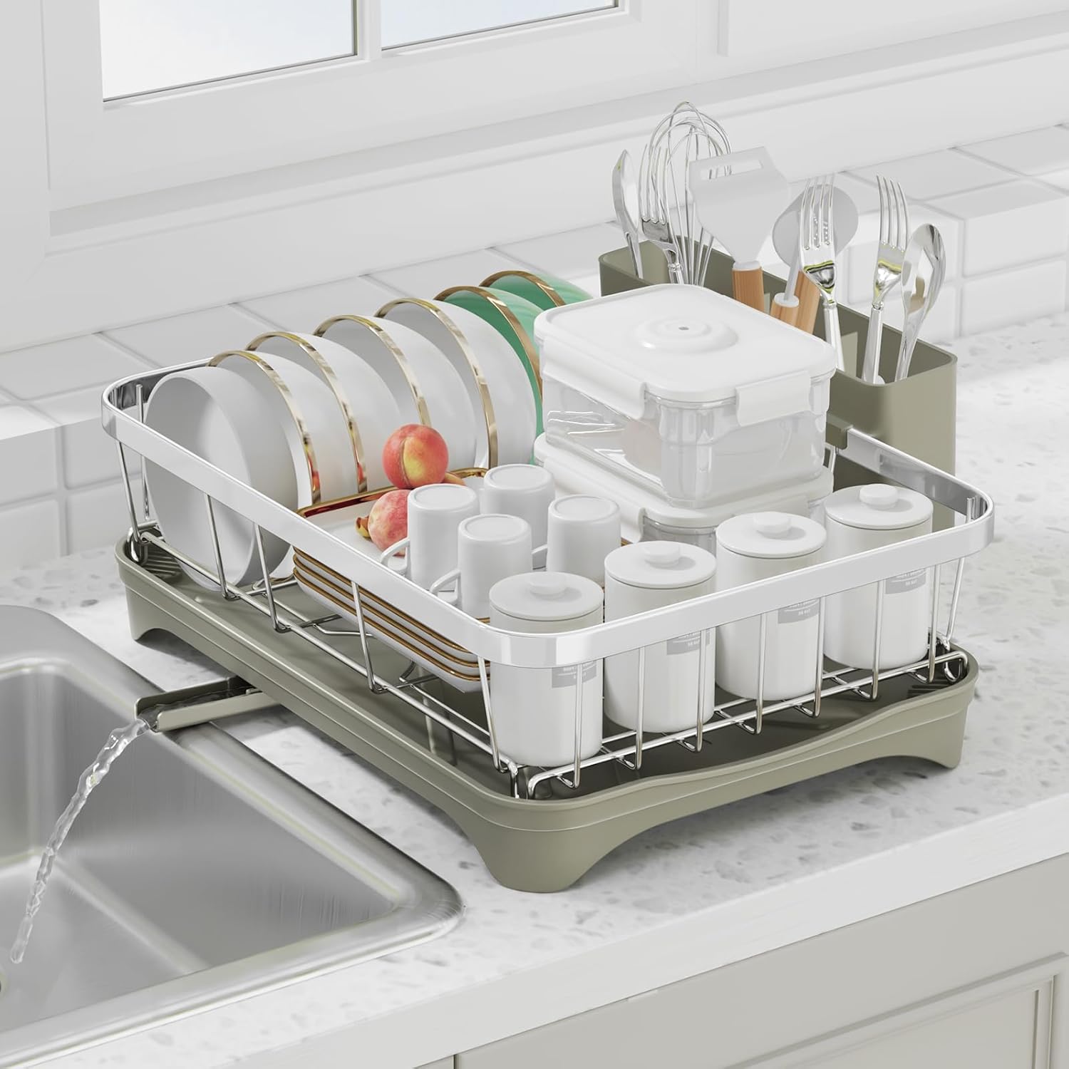 • Premium 304 Stainless Steel Dish Drying Rack :Constructed with 304 stainless steel and equipped with a drainage board, this kitchen utensil drying rack effectively resists rust and deformation. All edges are rounded and polished to prevent scratches and damage to your tableware, providing reliable protection.
