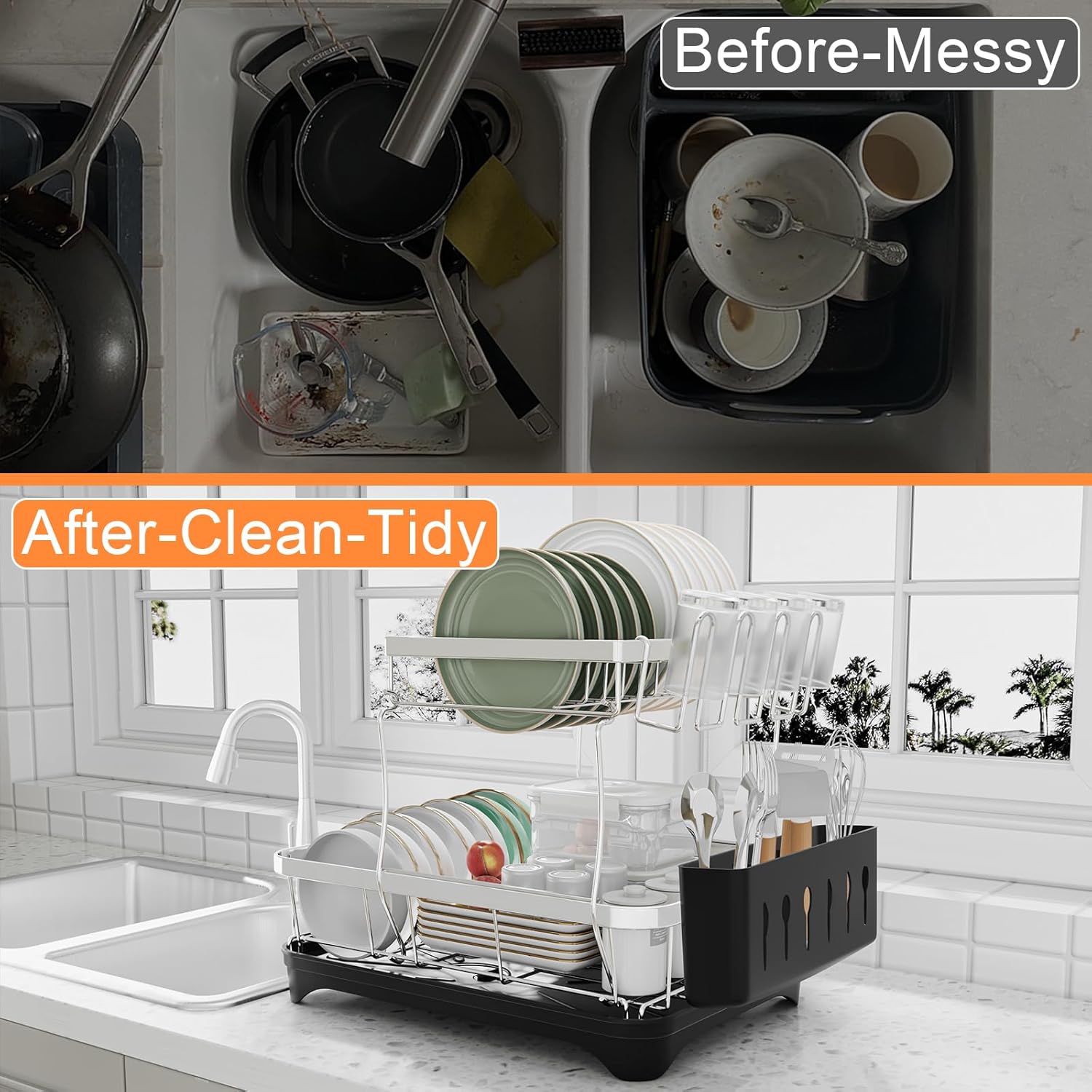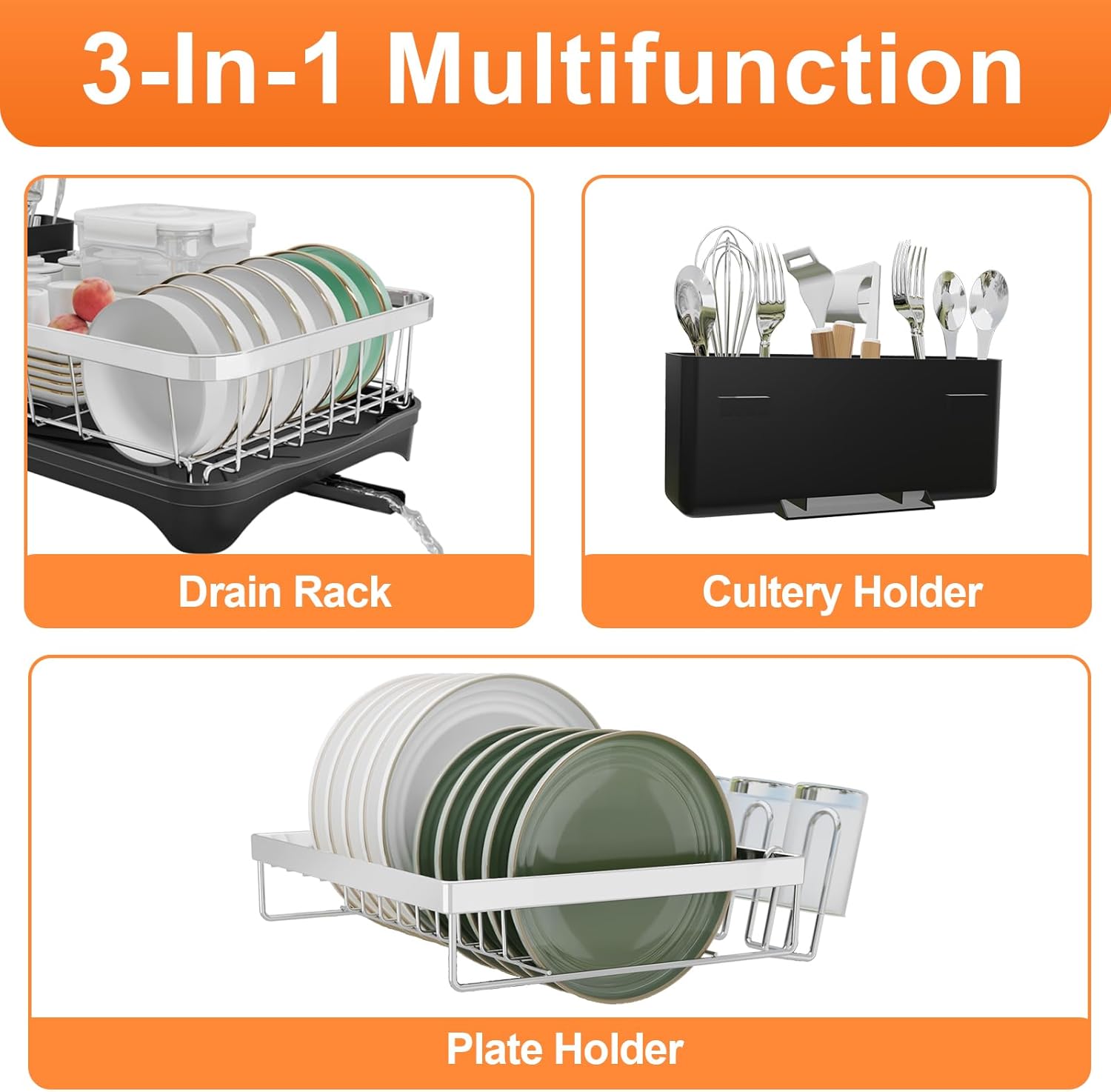• Multifunctional Dish Rack : This kitchen dish drying rack comes with a cup rack and 3 slots utensil holder. The cutlery box and cup holder can accommodate different cutlery and drinking glasses. the side cutlery rack can hold various utensils, meet your needs for storing kitchenware.