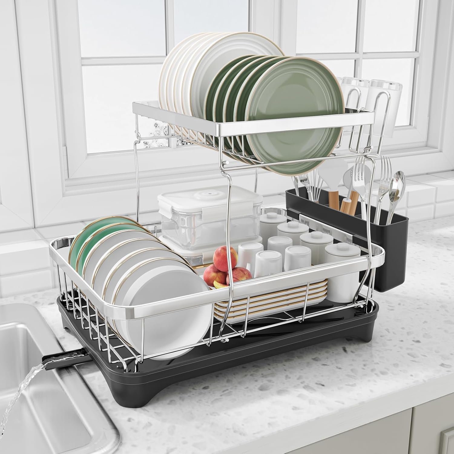 Dish Drying Rack - 2-Tier 304 Stainless Steel Dish Rack for Kitchen Counter, Adjustable Spout Auto-Draining Dish Rack, Kitchen Organizers and Storage Rack with Drainboard and Cutlery Holder Black