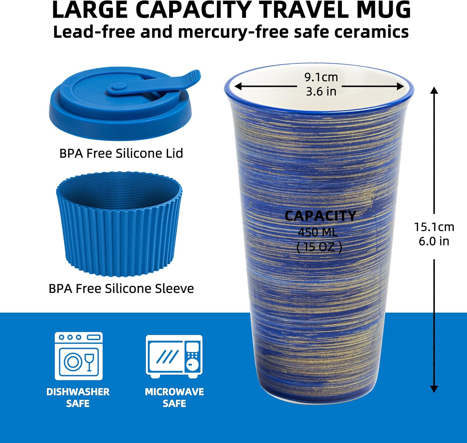 Travel Coffee Mug Blue, Ceramic Coffee Mug With Lid And Drinking Straw(15oz/450ml), Handcrafted Novelty Travel Mugs, Microwave & Dishwasher Safe Tumbler With Lid, Unique Gifts