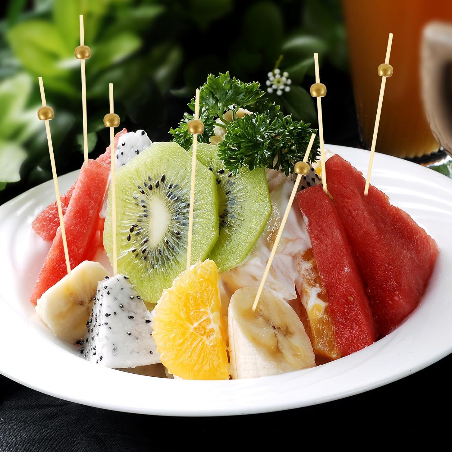 • HIGH QUALITY MATERIAL - These cocktail picks are made of natural bamboo and wood gold pearl. After grinding and high temperature fumigation, our bamboo picks are smoothly neat, burrs-free and safe for food skewering.