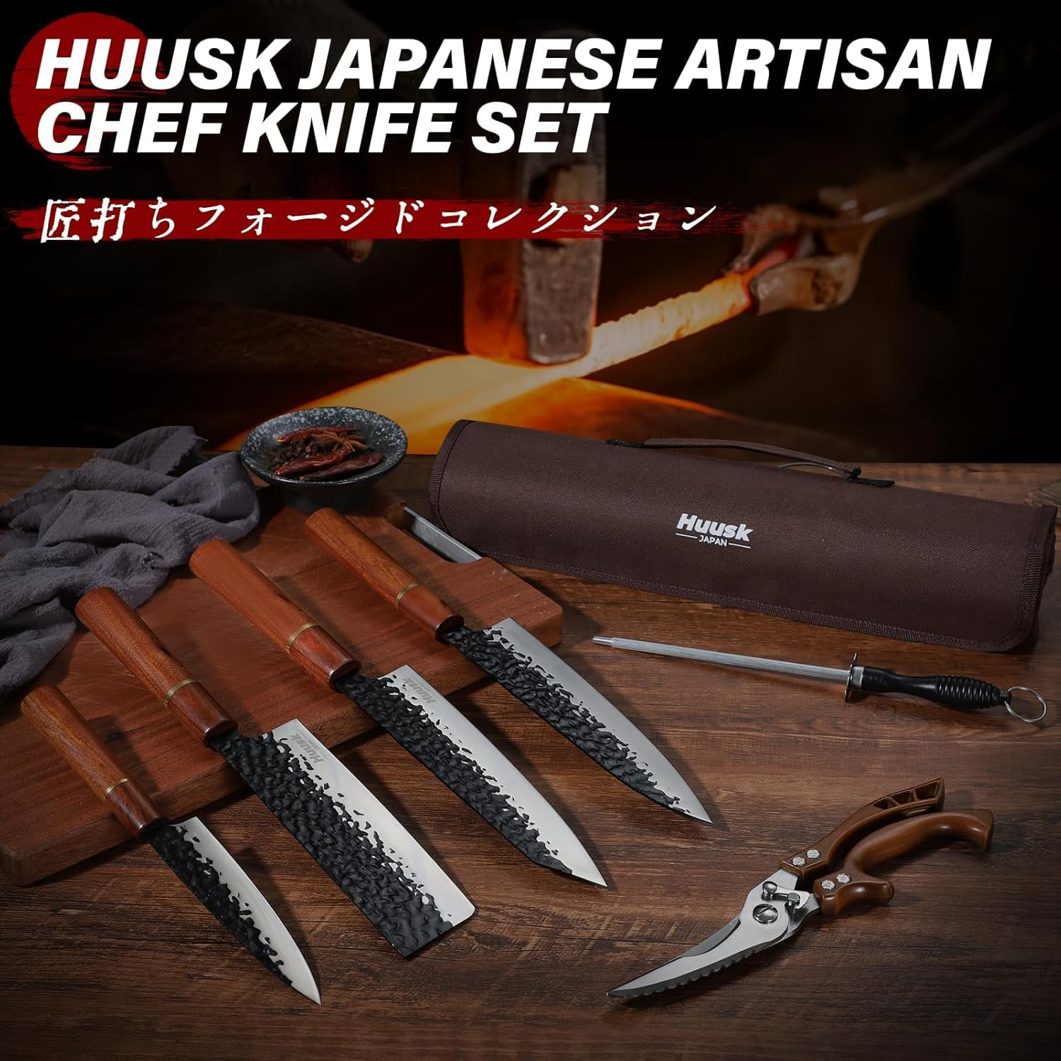 Huusk Japanese Knife Set 6pcs with Covers - Professional Chef Knife Set with Bag & Sharpener, High Carbon Steel Forged Knives Sets with Scissors, Japanese Kitchen Knives Sets, Gift for Men Women