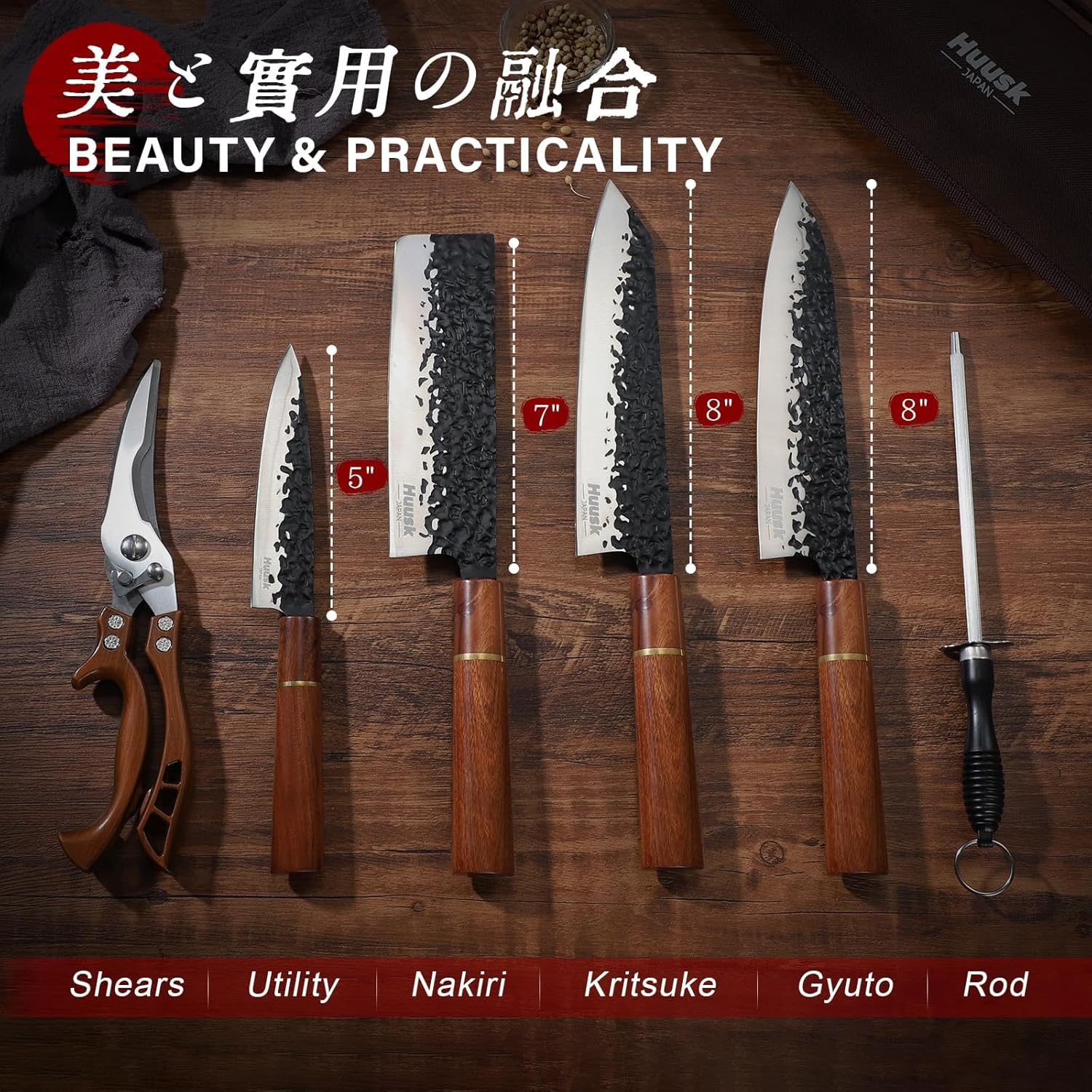 • Versatile Knife Set for Everyday Cooking: This Huusk Japanese Knife Set includes a gyuto knife, kiritsuke knife, utility knife, nakiri knife, poultry shears, honing steel, and a portable roll bag, covering most cutting tasks with precision and ease