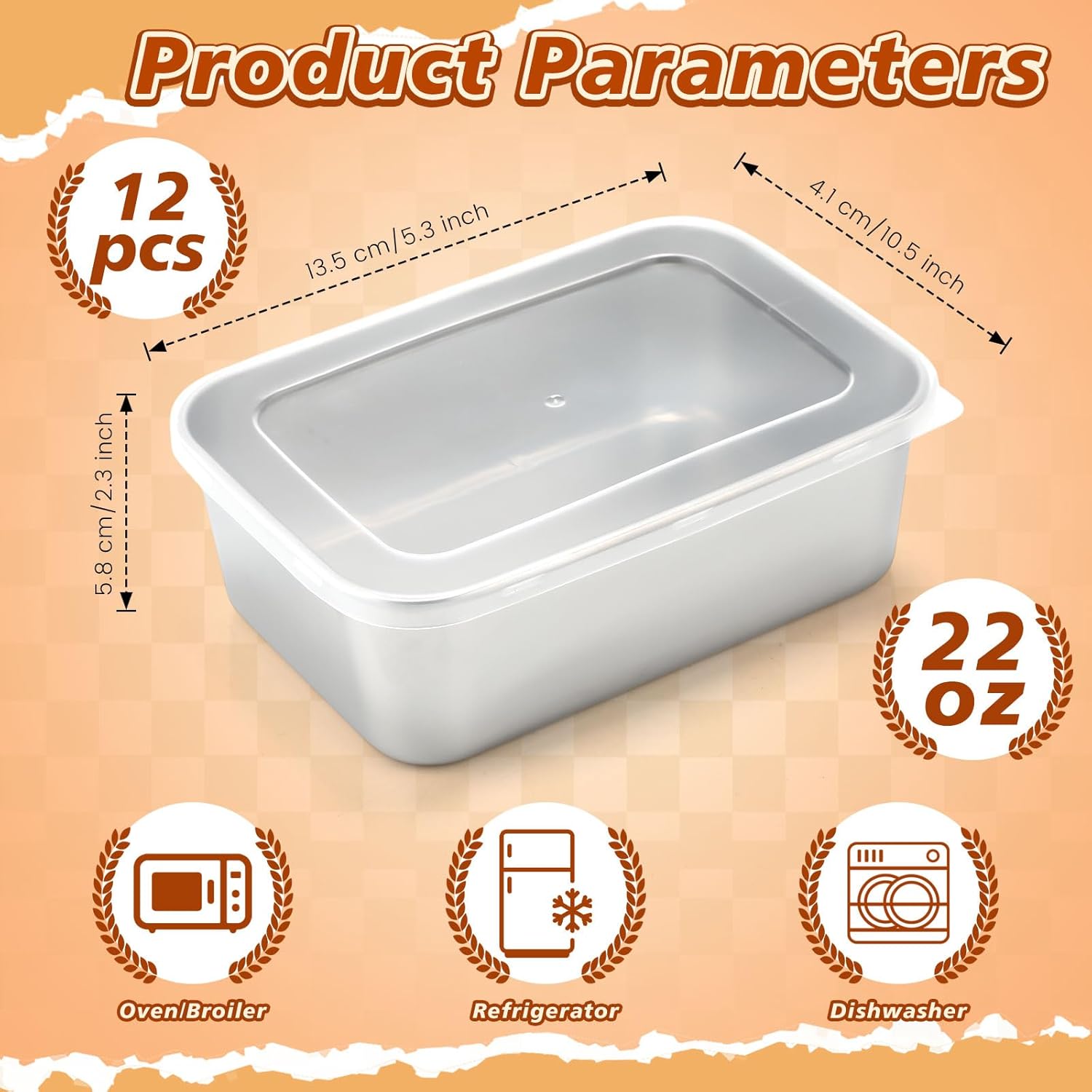 • Sufficient Quantity for Daily Use: this set includes 12 stainless steel food containers with clear lids(complimentary item with no leakage prevention), each measuring 5.3 x 4.1 x 2.3 in, with a 22 oz (≈650 ml) capacity. Ideal for single meals, snacks, or ingredient portions, they are stackable and space-saving for cabinets, refrigerators, or pantries—ideal for home meal prep or restaurant catering