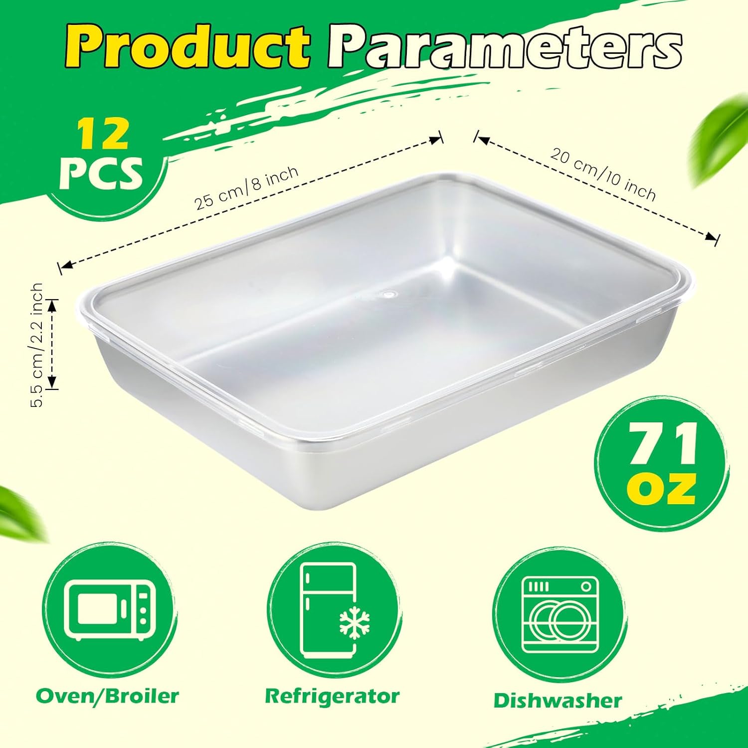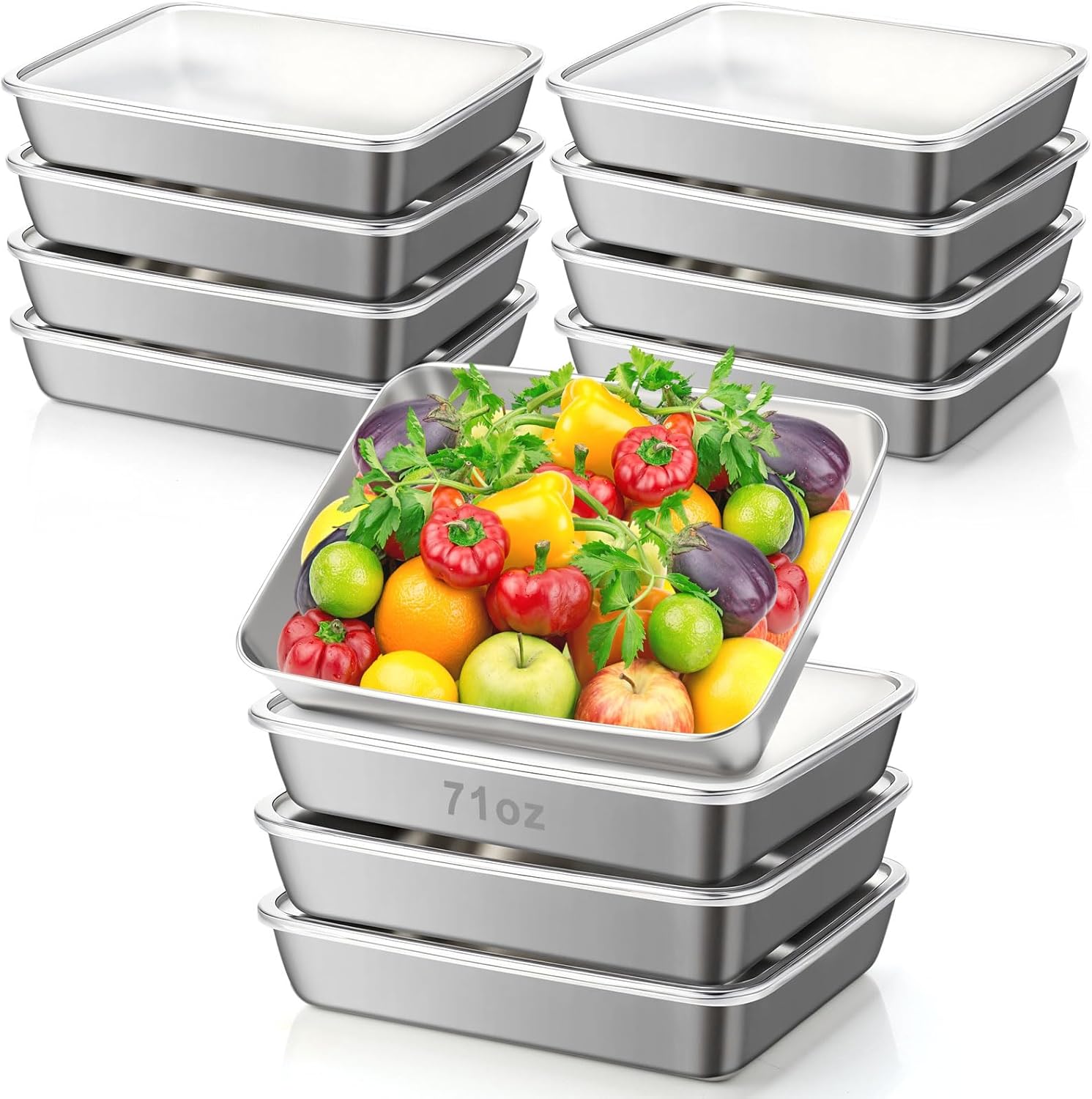 • Sufficient Quantity for Daily Use: this set includes 12 stainless steel food containers with clear lids(complimentary item with no leakage prevention), each measuring 10 x 8 x 2.2 in, with a 71 oz (≈2100 ml) capacity. Ideal for family-size portions, bulk meal prep, or storing fresh produce, they are stackable and space-saving for cabinets, refrigerators, or pantries—ideal for home meal prep or restaurant catering