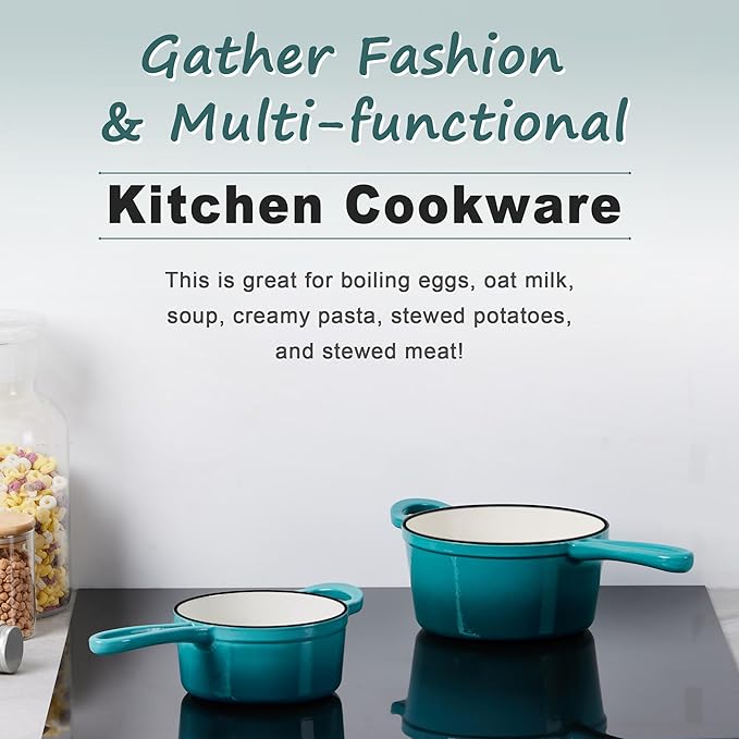 1 Qt & 2 Qt Sauce Pan Sets, Leonyo Enameled Cast Iron Sauce Pan with Lid, Small Saucepan Cast Iron Dutch Oven Kitchen Cookware for All Cooktops Cooking Pasta, Milk, Oatmeal - Up to 500°F, Lake Green