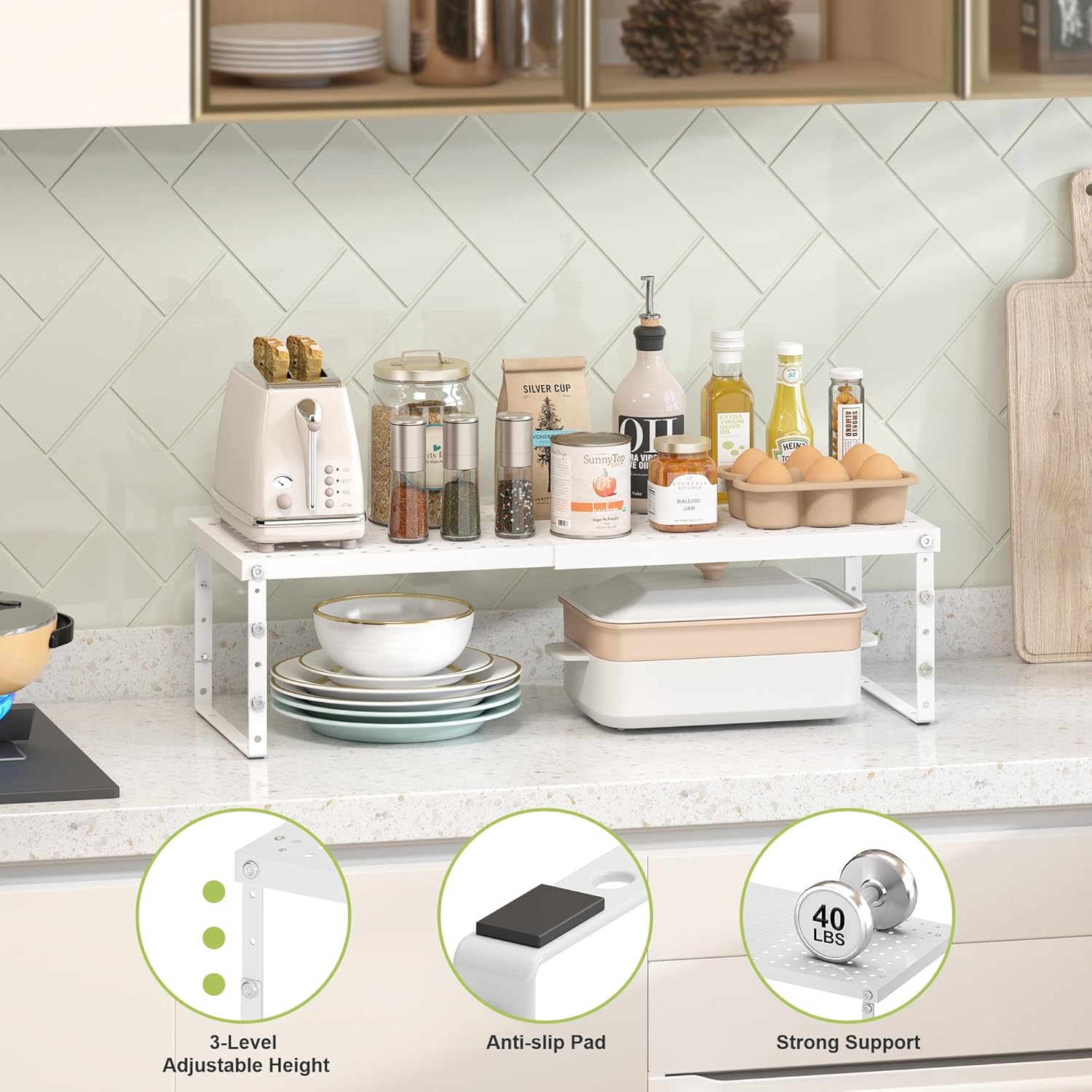 • 【Heavy Duty Metal Shelf Riser】Pantry organizer shelves rack is made of premium metal pannel with thicken powder coating, our kitchen counter shelf is strong, rustproof, and easy to clean, ensuring long-lasting use. Stackable countertop organizer is powerful enough to hold up to 40lb each pack. Shelf organizer is capable of holding a variety of kitchen utensils, including spice bottles, cans, and even toasters.