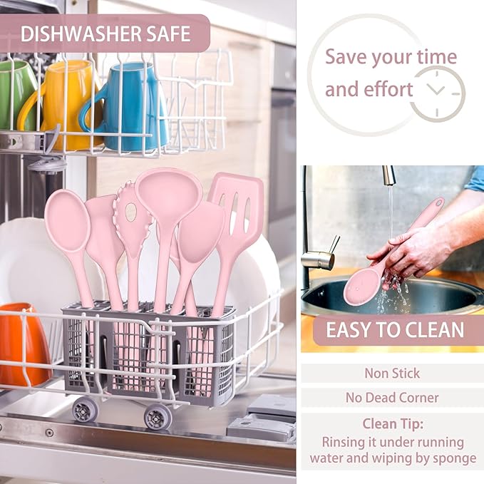 P&P CHEF Silicone Cooking Utensils Set of 7, Heat-proof Kitchen Utensils Set for Nonstick Cookware, Non-stick Spatula, Slotted Turner, Soup Ladle, Pasta Server, Spoon for Cooking Serving - Pink