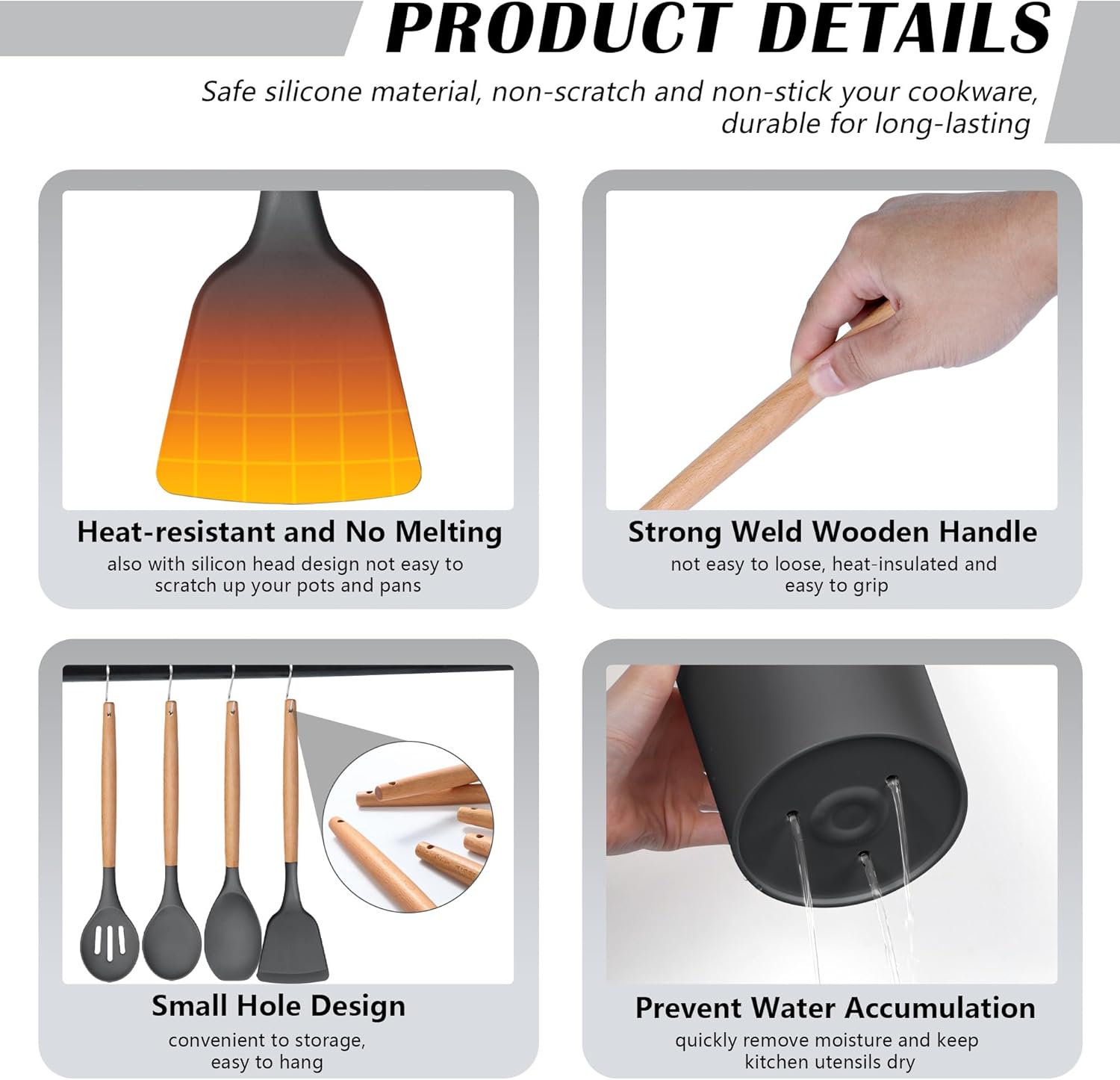 • COMFORTABLE WOODEN HANDLES: The silicone kitchen utensils set is crafted with a smooth, natural wood handle, heat-resistant and long time cooking without burning hands, Ergonomic design to reduce hand fatigue, comfortable to hold and provide a secure grip, not easy to slip in your hand, Beautiful wooden handle enhances kitchen style and aesthetic, handle with hole for easy storage, saving your kitchen space, Hand washing is recommended to preserve the texture of the wooden handle