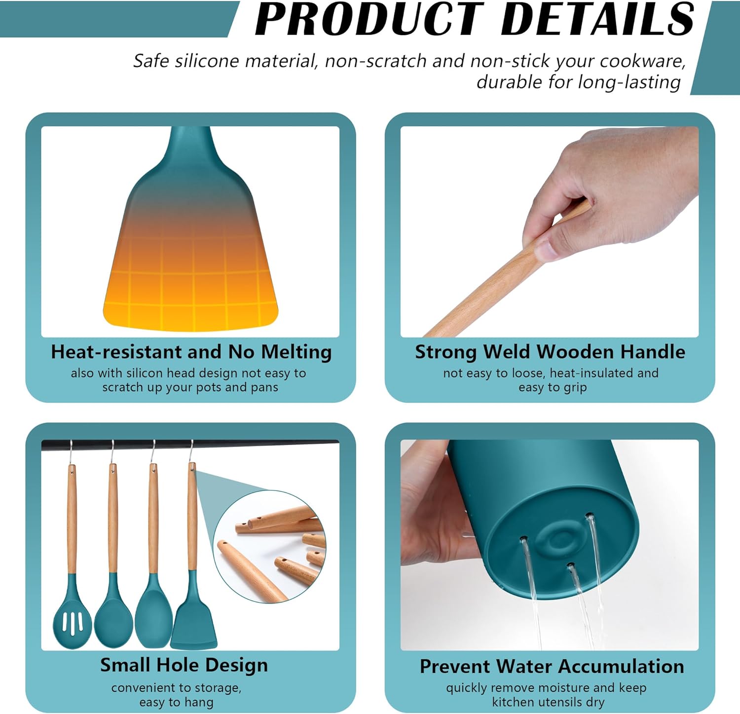 • COMFORTABLE WOODEN HANDLES: The silicone kitchen utensils set is crafted with a smooth, natural wood handle, heat-resistant and long time cooking without burning hands, Ergonomic design to reduce hand fatigue, comfortable to hold and provide a secure grip, not easy to slip in your hand, Beautiful wooden handle enhances kitchen style and aesthetic, handle with hole for easy storage, saving your kitchen space, Hand washing is recommended to preserve the texture of the wooden handle