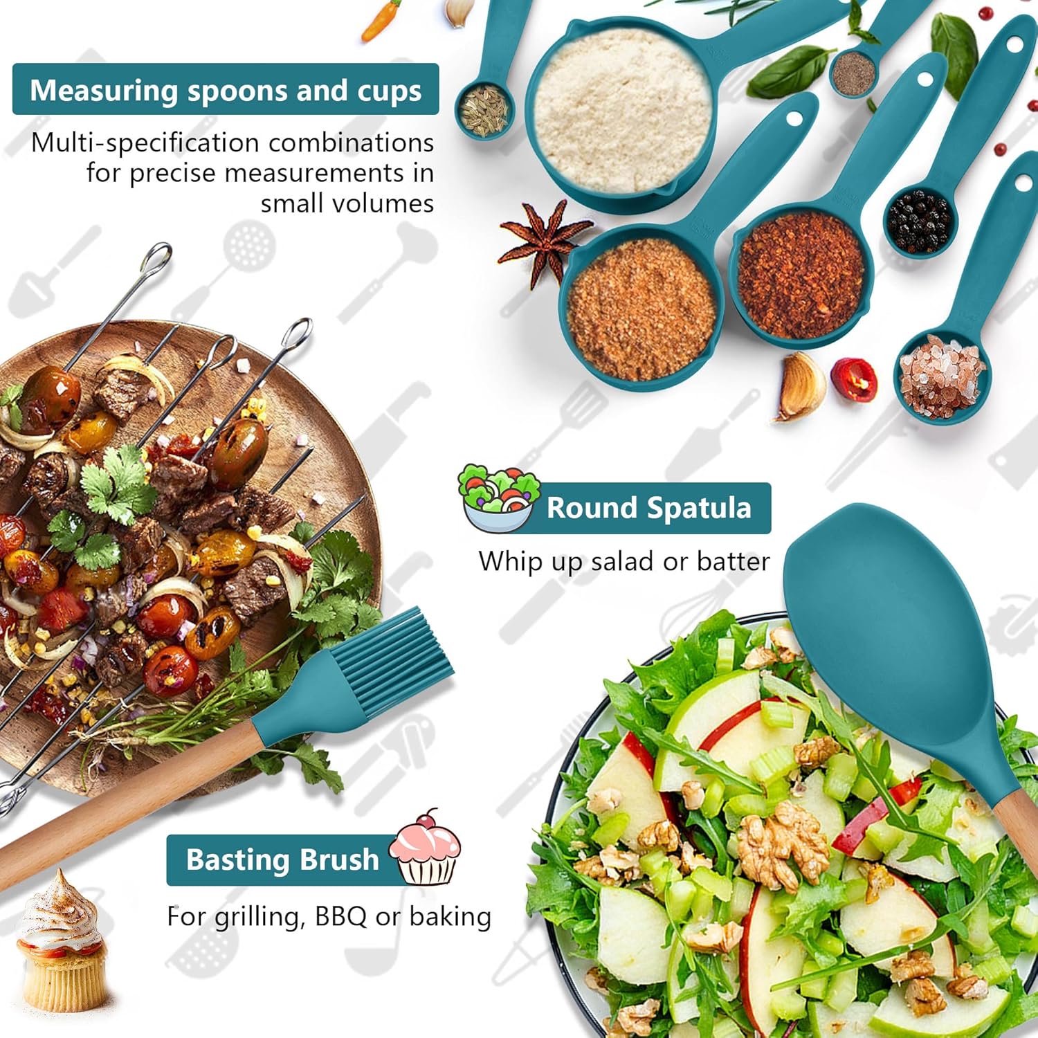 HaWare Kitchen Cooking Utensils Set, 23-Piece Silicone Kitchen Utensils Spatula Set with Holder, Heat Resistant Wooden Handle Kitchen Gadget for Nonstick Cookware, Food-grade Turner Spoon Sets (Blue)
