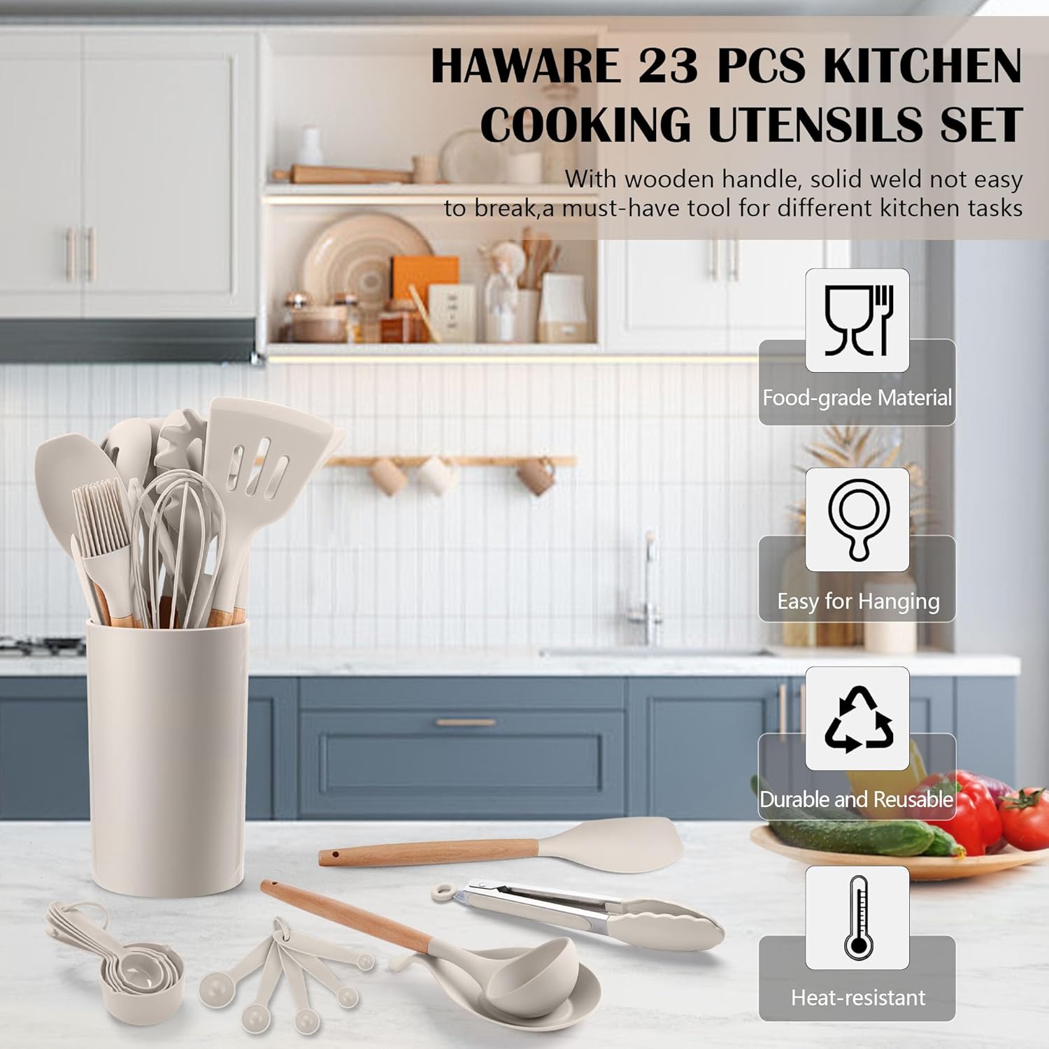 HaWare Kitchen Cooking Utensils Set, 23-Piece Silicone Kitchen Utensils Spatula Set with Holder, Heat Resistant Wooden Handle Kitchen Gadget for Nonstick Cookware, Food-grade Turner Spoon Sets (Khaki)