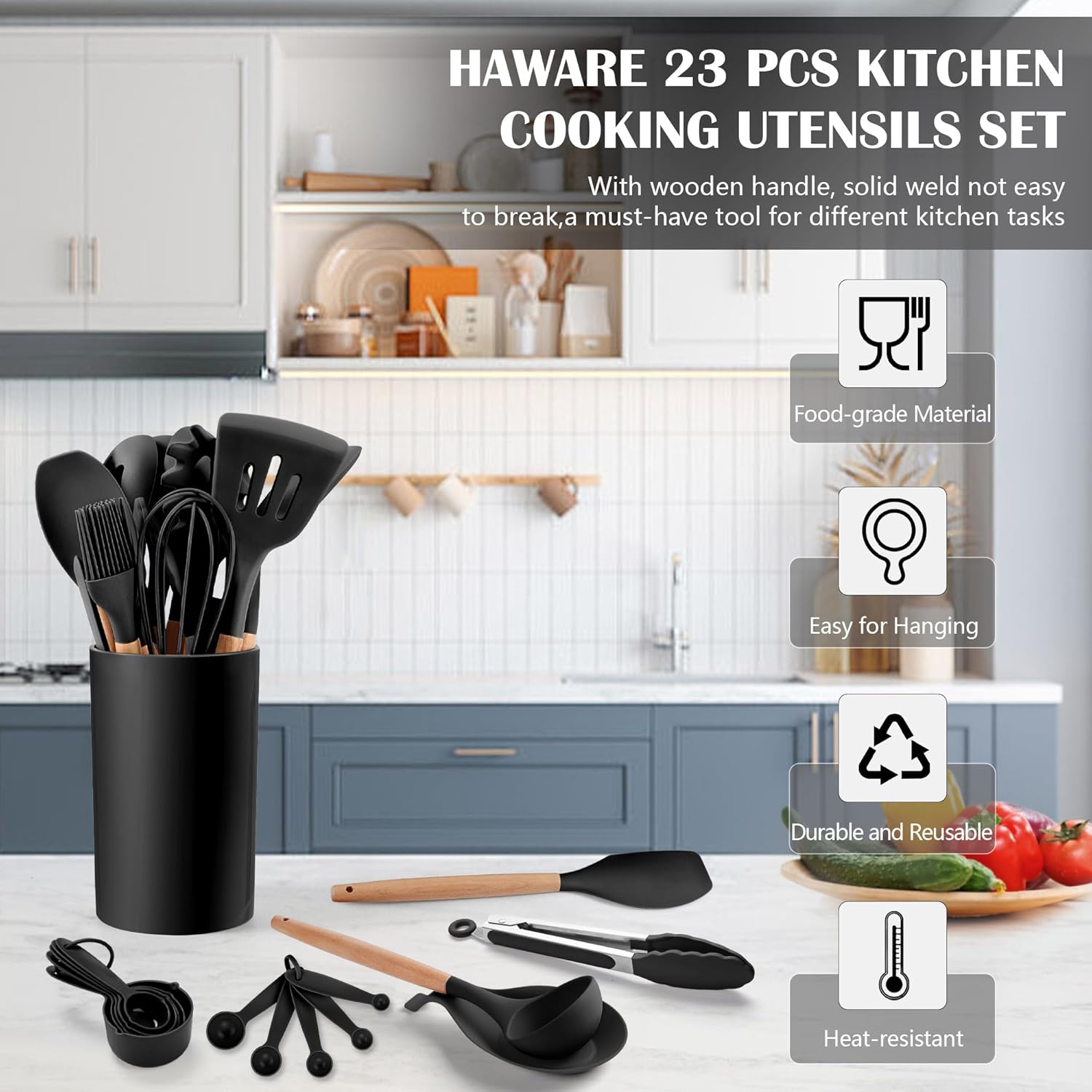 HaWare Kitchen Cooking Utensils Set, 23-Piece Silicone Kitchen Utensils Spatula Set with Holder, Heat Resistant Wooden Handle Kitchen Gadget for Nonstick Cookware, Food-grade Turner Spoon Sets (Black)