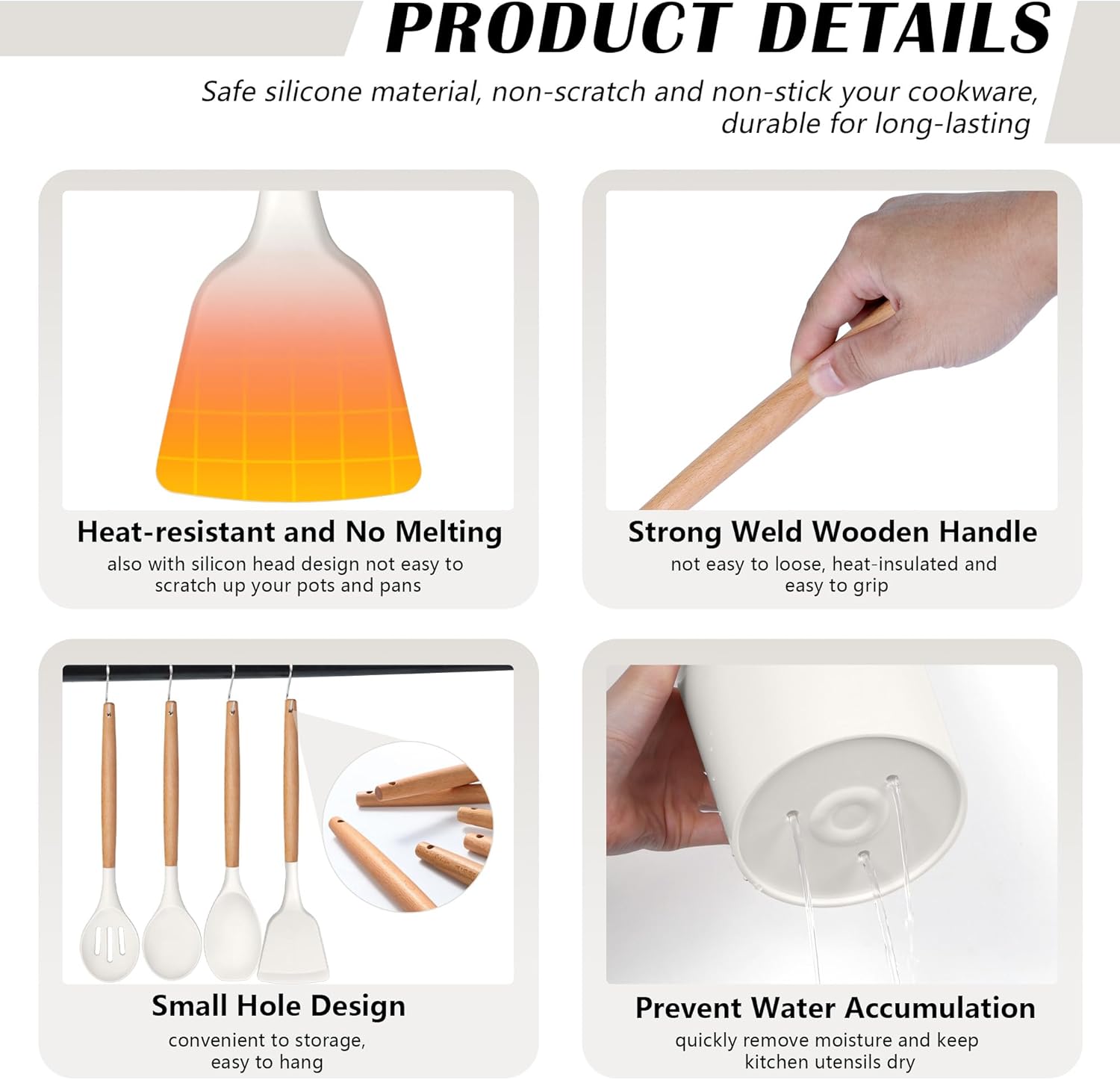 • COMFORTABLE WOODEN HANDLES: The silicone kitchen utensils set is crafted with a smooth, natural wood handle, heat-resistant and long time cooking without burning hands, Ergonomic design to reduce hand fatigue, comfortable to hold and provide a secure grip, not easy to slip in your hand, Beautiful wooden handle enhances kitchen style and aesthetic, handle with hole for easy storage, saving your kitchen space, Hand washing is recommended to preserve the texture of the wooden handle