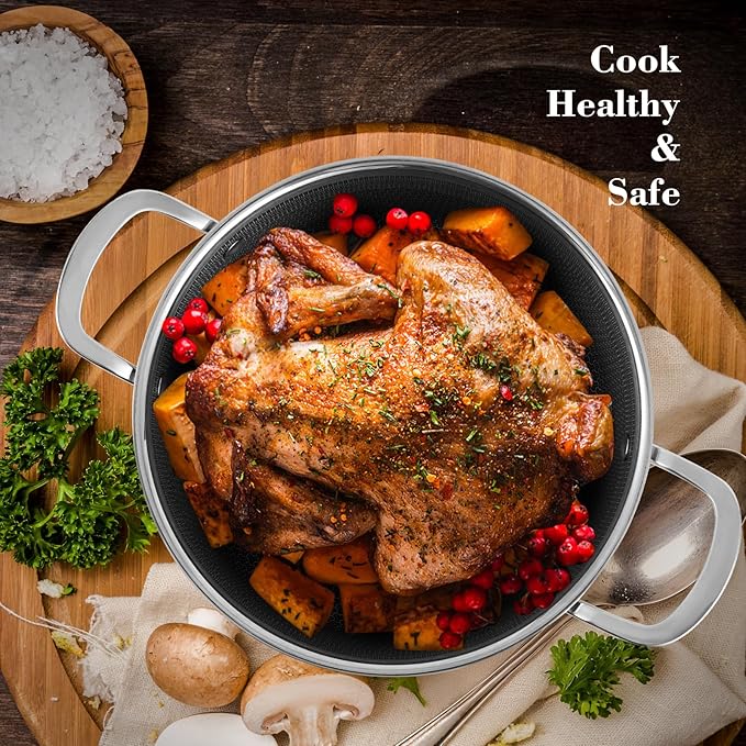 • 【Energy-Saving TriPly Performance:】Aluminum core heats 2x faster and retains heat longer, reducing cooking time and energy use. Even heat distribution ensures perfect browning with 30% less oil. Stainless steel cools quickly for safer handling, while warp-resistant bases guarantee long-term reliability.