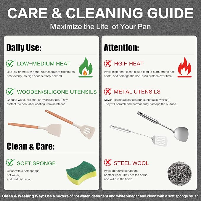 • 【Healthy Cooking, Happy Living-60% Less Oil & 100% Safe】 Cook smarter with our PFOA-free, non-toxic frying pan set that needs minimal oil. Fry bacon in its own fat, flip eggs without butter, or sear fish with just a spritz. Certified free of leadand cadmium, it's ideal for keto, low-calorie, and heart-healthy diets.