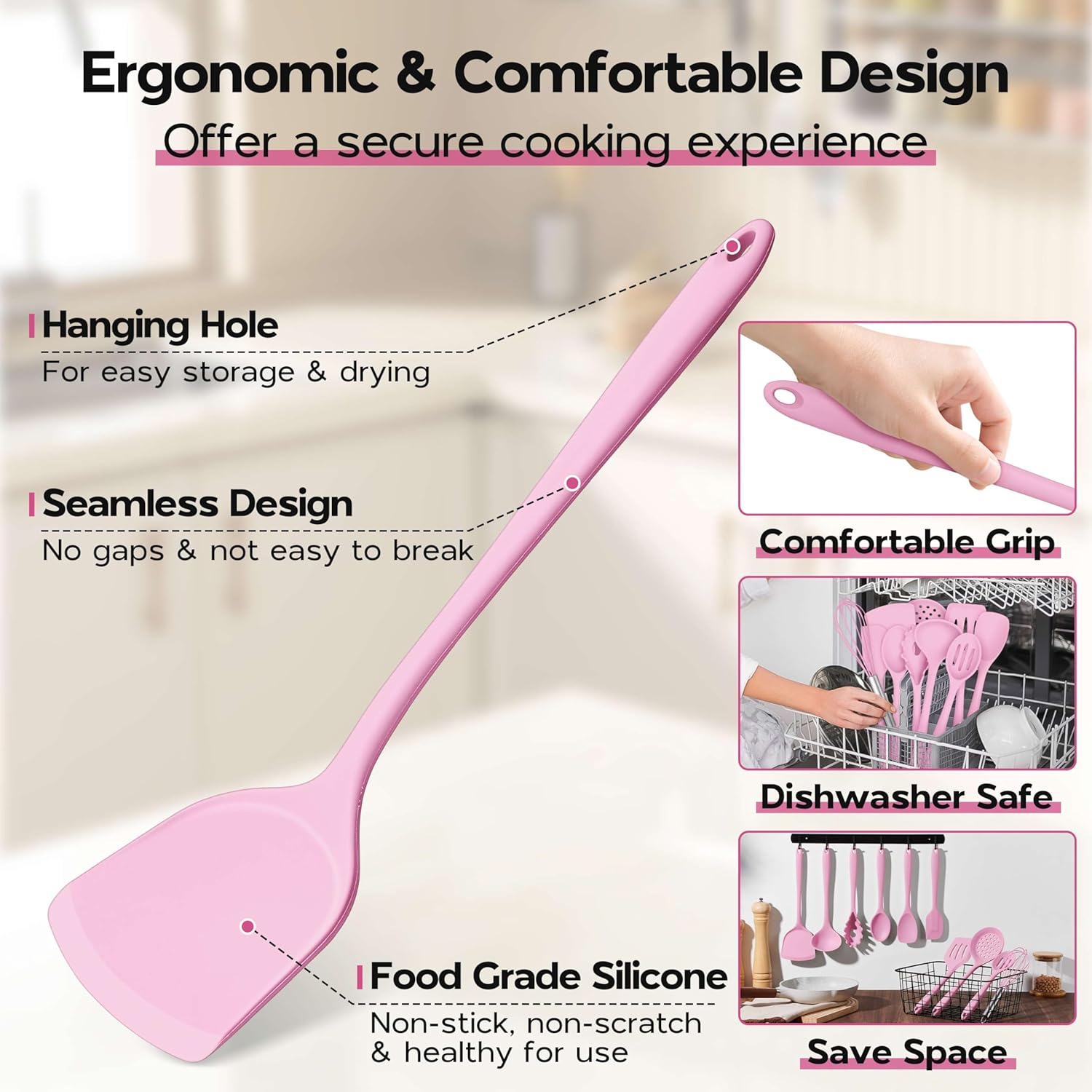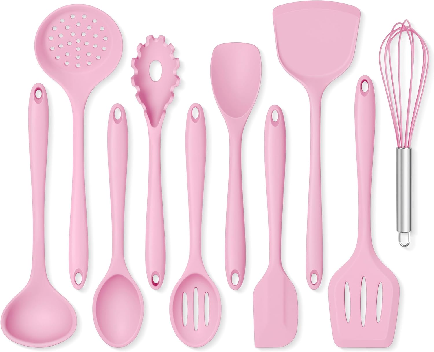 Onader Silicone Cooking Utensils Set, 10 Pieces Kitchen Utensils Set, Pink Kitchen Gadgets Tools Kit for Nonstick Cookware