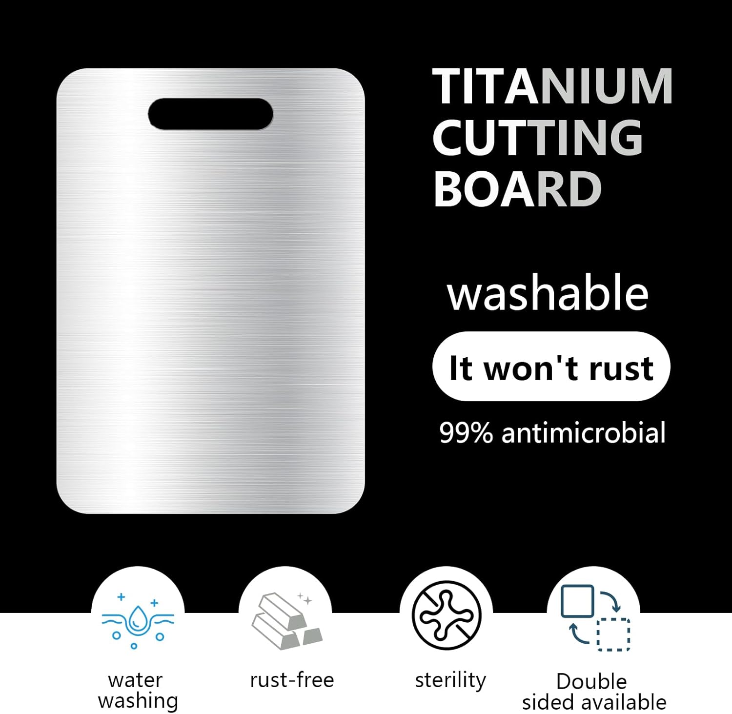 • Double-sided design: Titanium cutting boards adopt double-sided design: one side can cut meat, and the other side can cut fruits and vegetables to meet different cutting needs. Use in different areas can prevent odors and make the cooking process easier and more convenient.