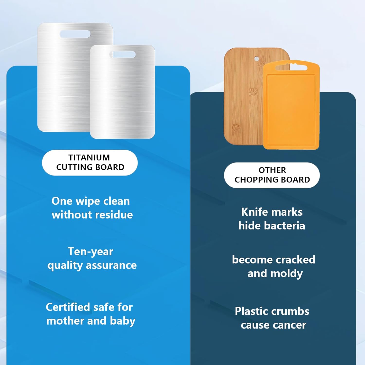• Durable Material: Cutting boards for kitchen are made of high-quality titanium alloy, which has excellent anti-warping and wear resistance. Scratches and dents caused by daily cutting, chopping and other operations are not easy to leave, and they can remain smooth and new even after long-term use.