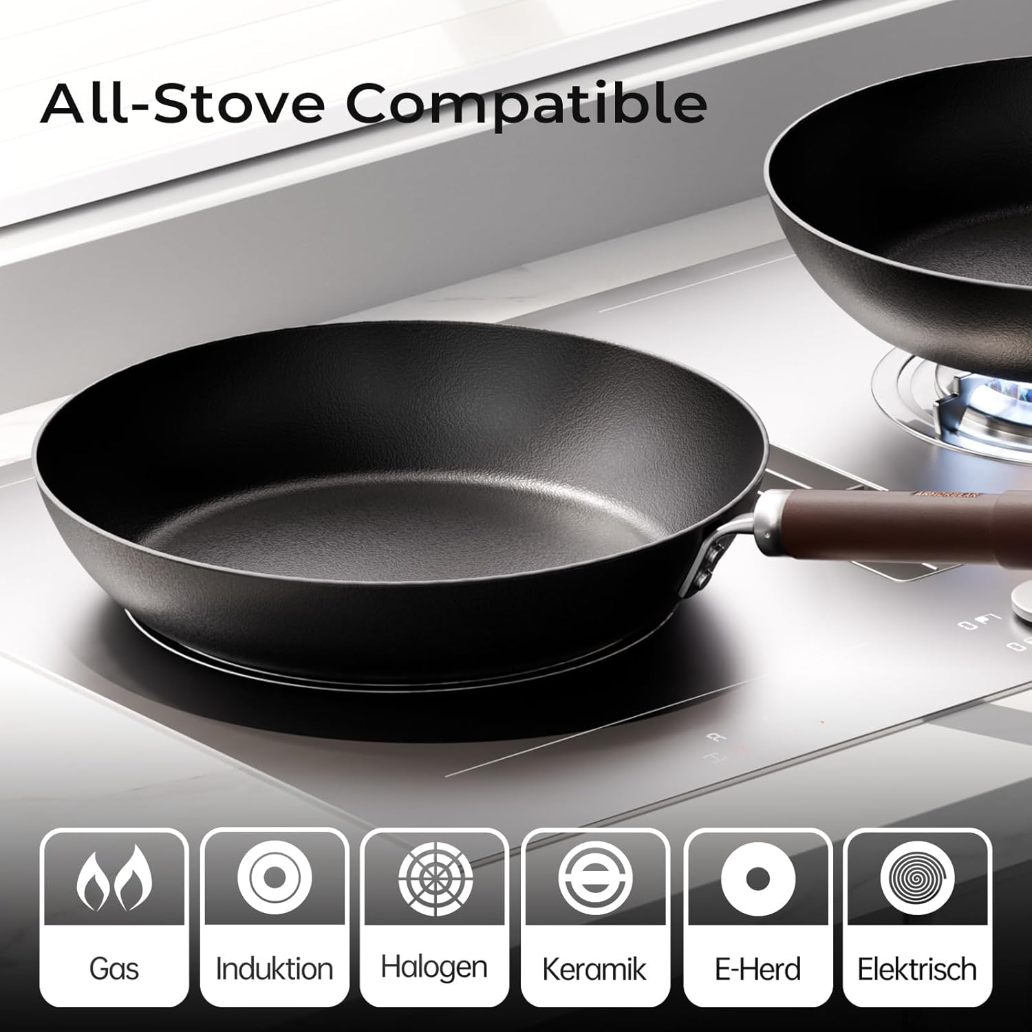 • Cool-Grip Assurance-----Our carbon steel frying pan features a heat-resistant wooden handle that stays cool on all stovetops (gas, electric, and induction), allowing you to cook longer without hand fatigue or the risk of burns.
