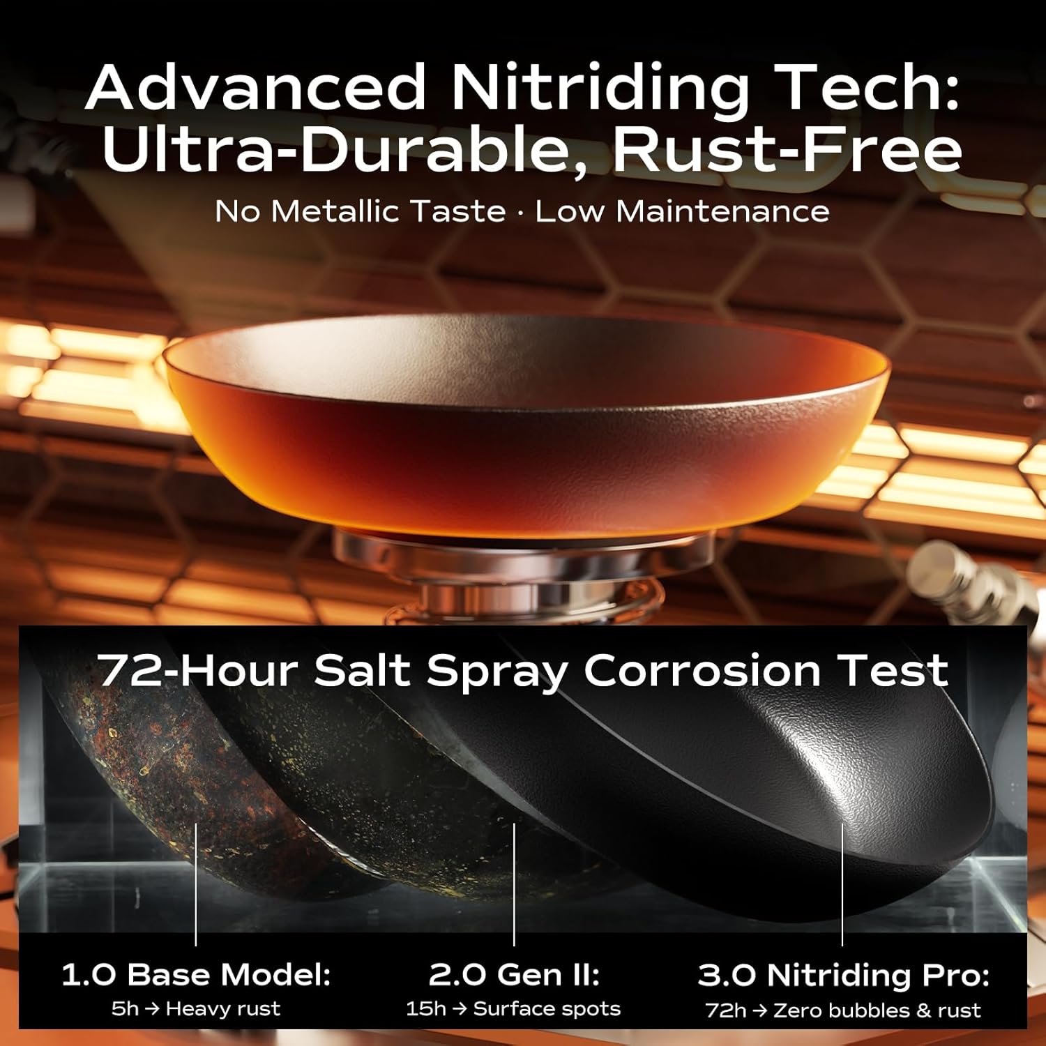 • Ultra-Durable Defense System-----This cooking pan is treated with advanced nitriding to create a rustproof surface that stands up to heavy use. It comes pre-oiled and is ready to go—just rinse, dry, and start cooking!