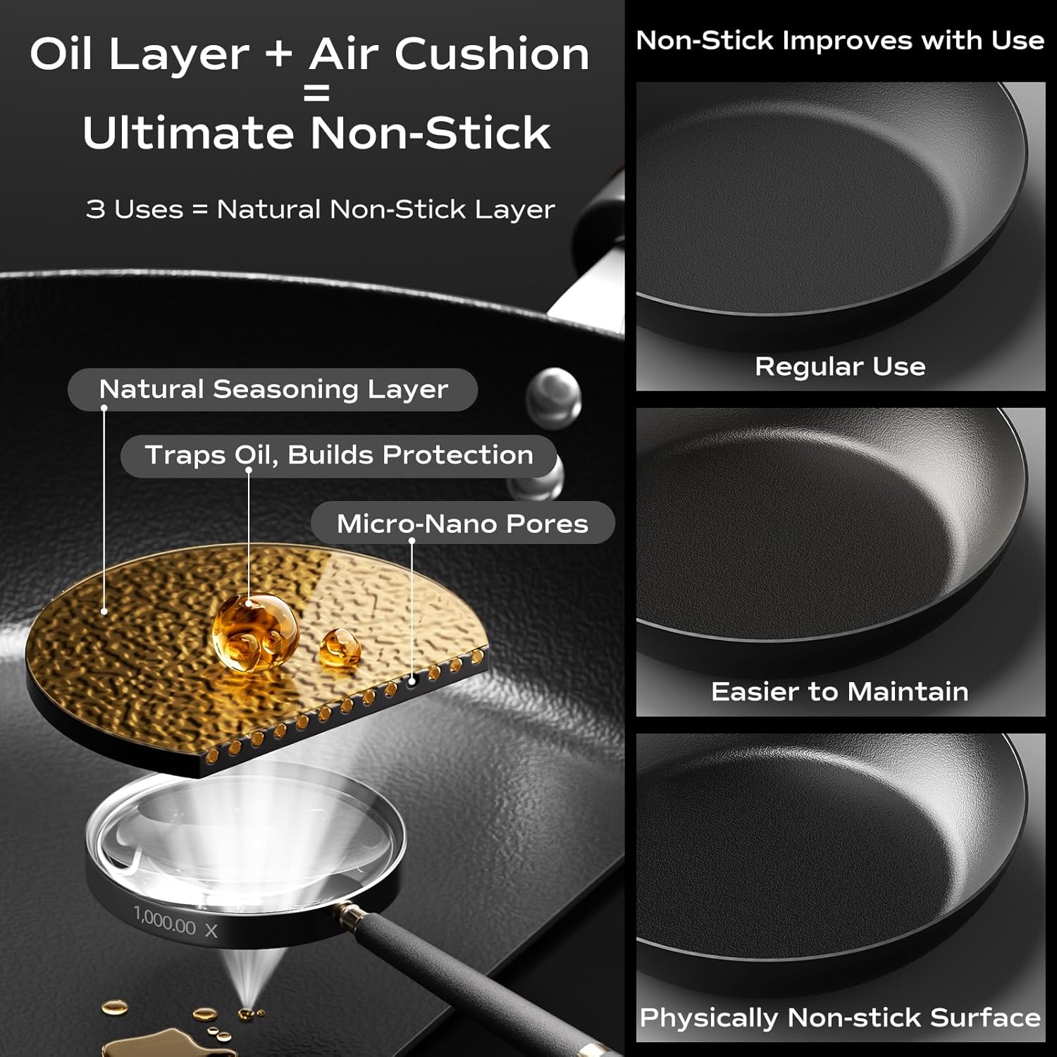 • Natural Oil-Seasoning Technology-----The skillet's textured surface naturally bonds with cooking oils during use, developing a durable, chemical-free non-stick layer that enhances performance over time. Requires less seasoning oil than traditional pans for optimal results while maintaining effortless maintenance—the more you cook, the better it performs.