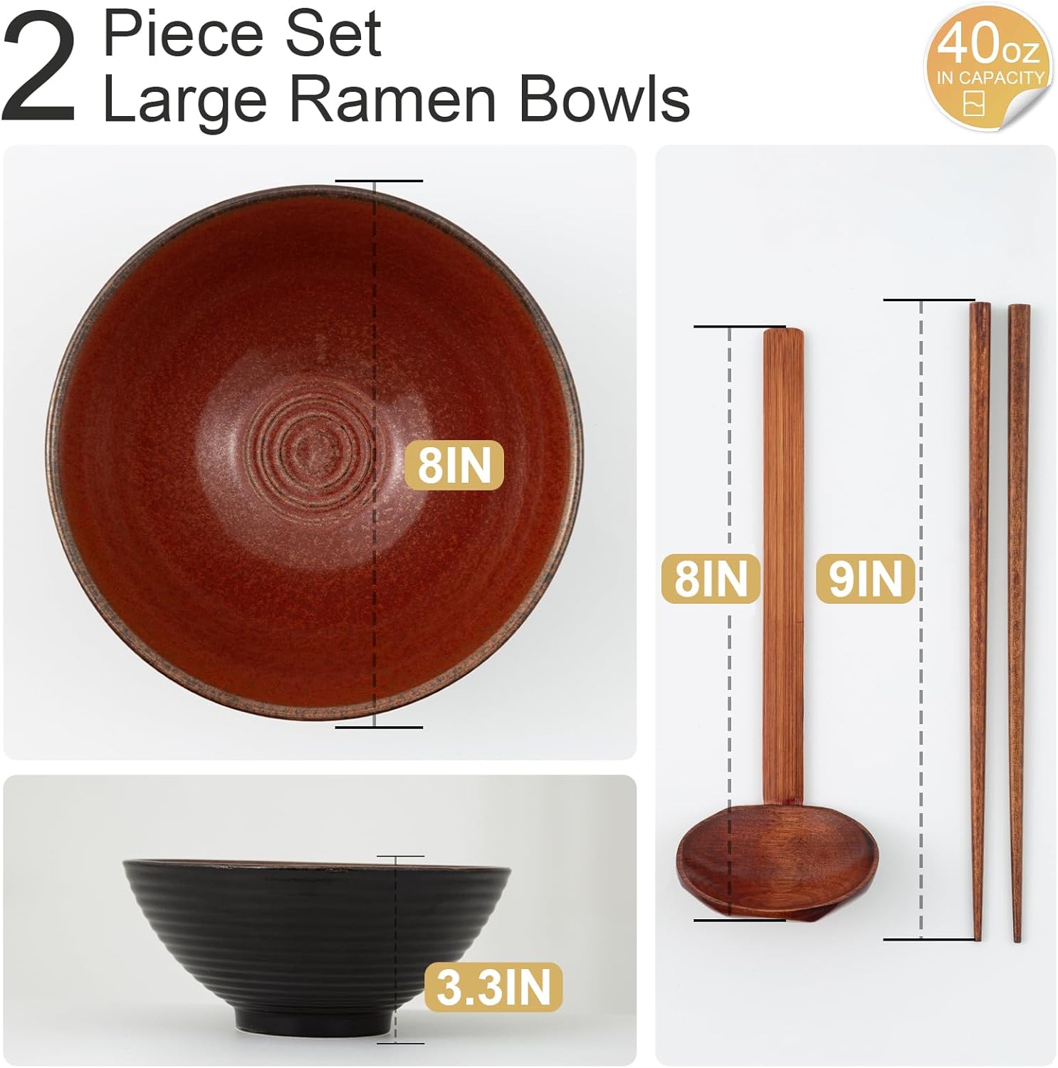 8 Inch Ceramic Ramen Bowl Set of 2, 40oz Japanese Bowls with Spoons & Chopsticks,Durable,Microwave & Dishwasher Safe,Perfect for Ramen,Pho,Salad,Soup,Noodles,Mixing bowls(Carnelian)