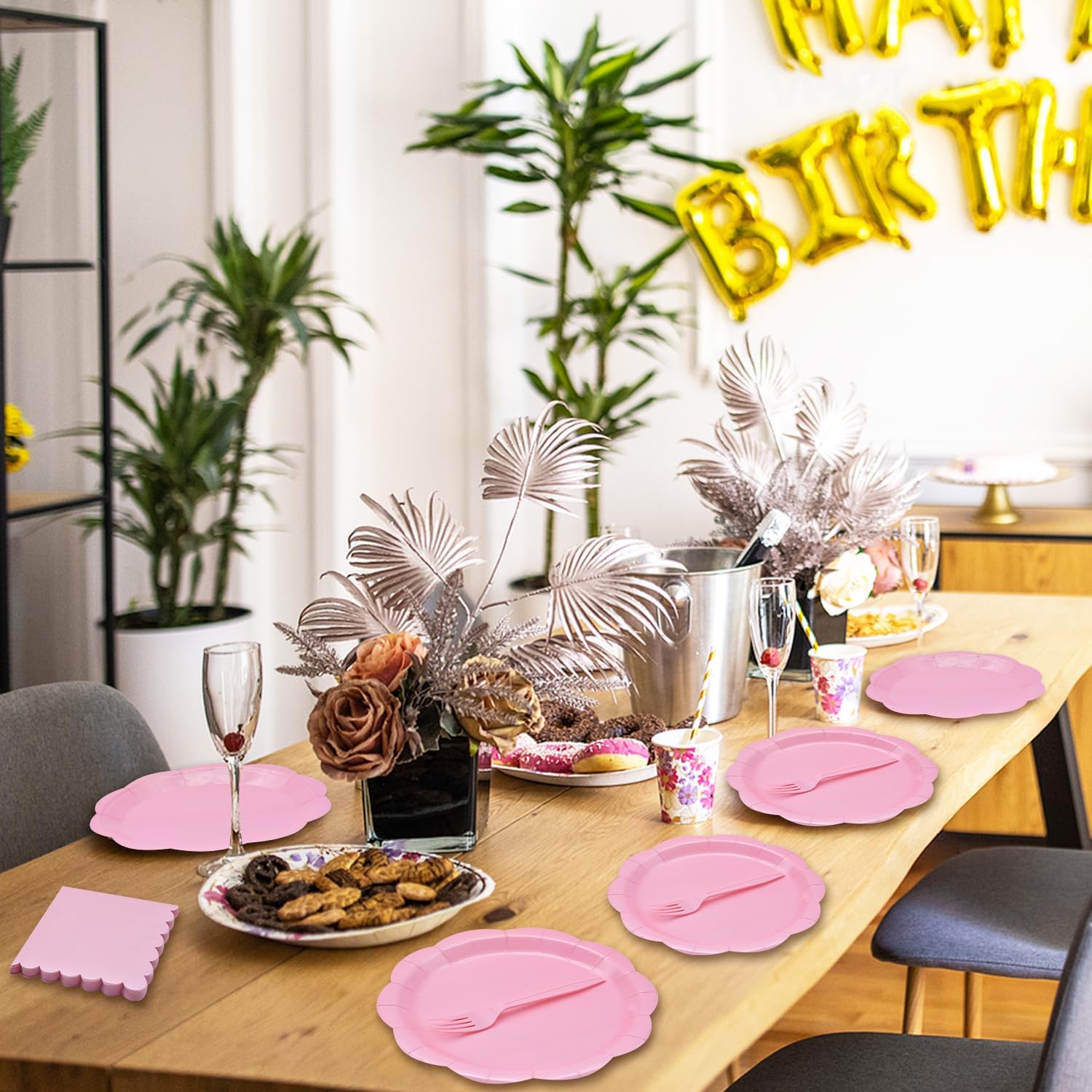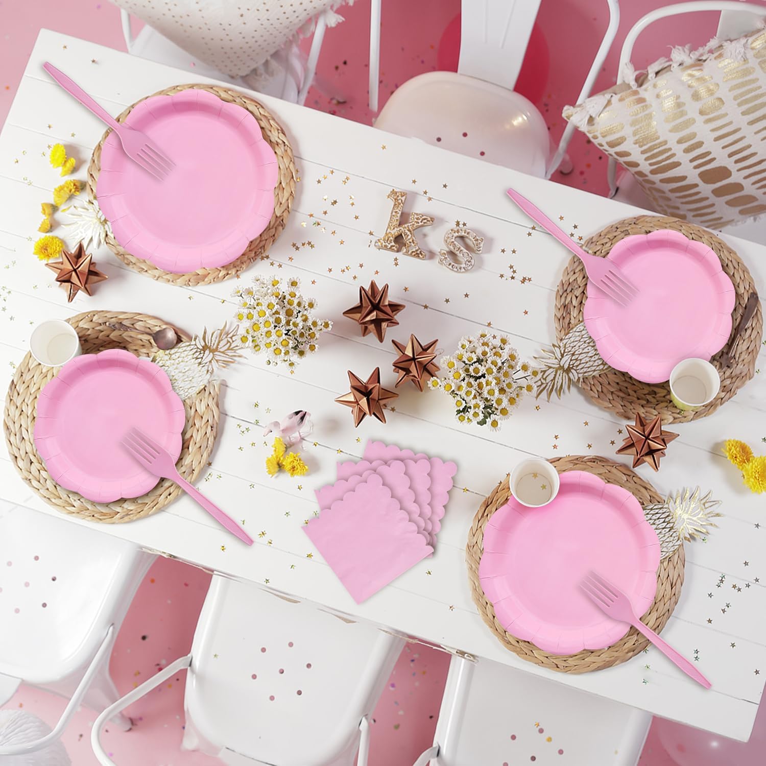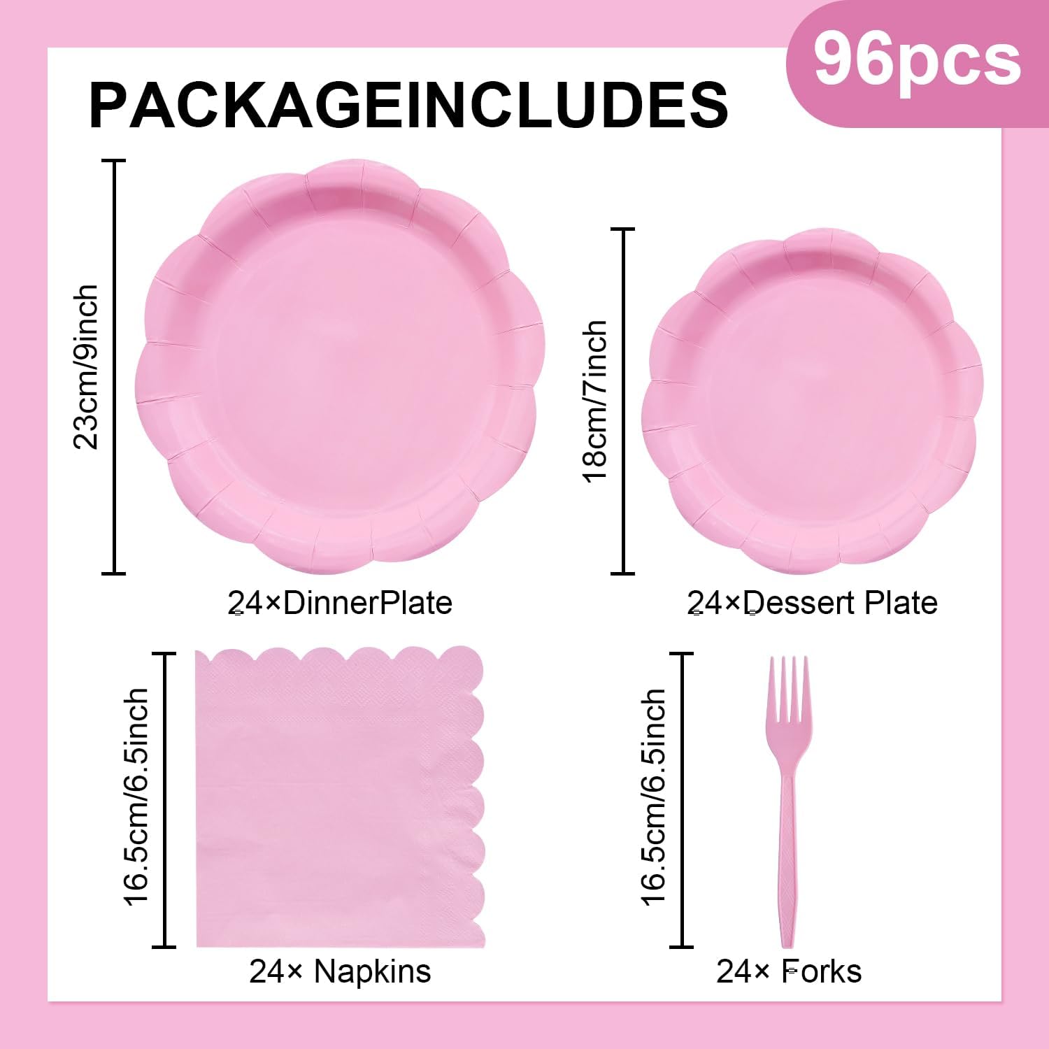 96 Pieces Pink Scalloped Tableware Set Party Supplies – Solid Color Disposable Dinnerware with Paper Plates, Napkins, and Forks for Girls Birthday, Baby Showers, Tea Parties – Serves 24