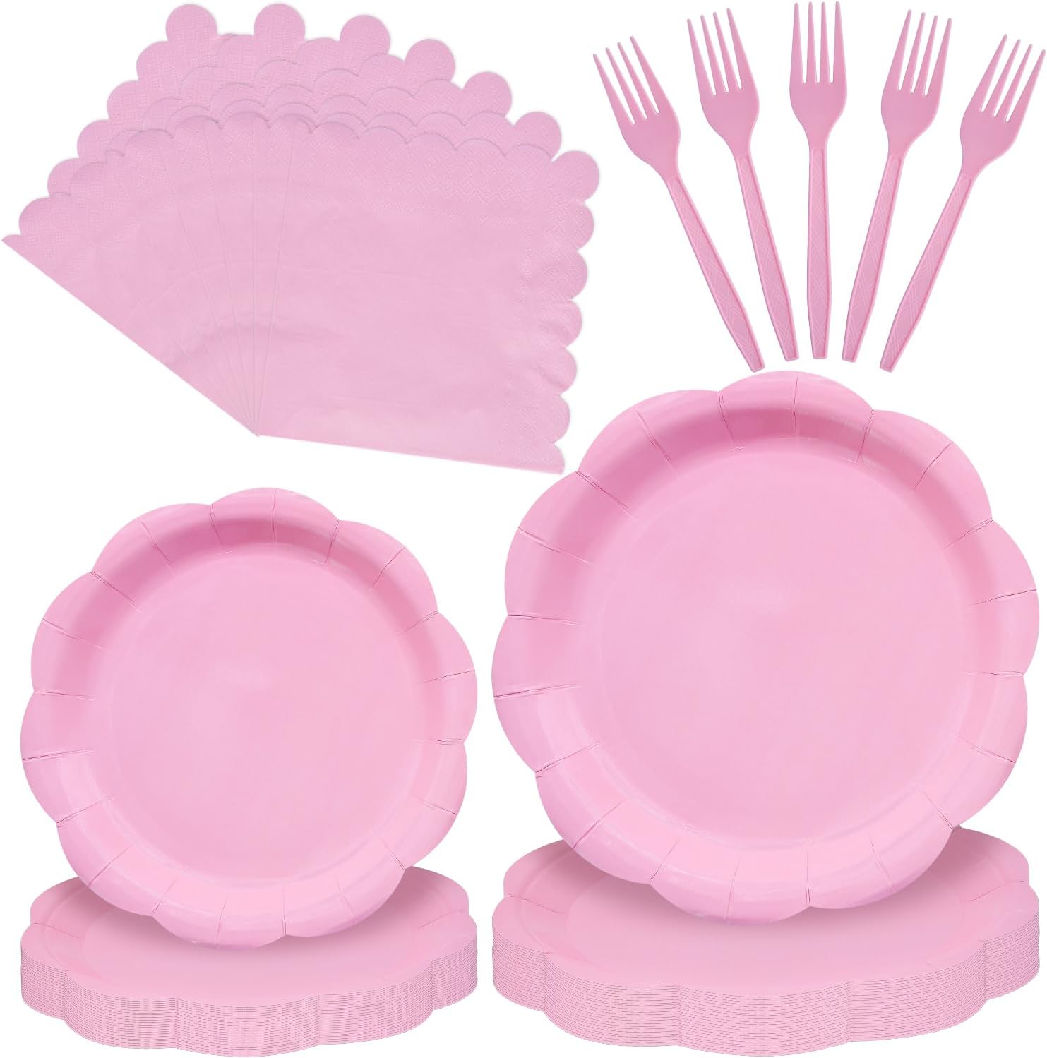 • Comprehensive Party Pack – This set includes 24 large 9-inch dinner plates, 24 smaller 7-inch dessert plates, 24 scalloped napkins, and 24 coordinating pink forks—everything you need to serve up to 24 guests with ease and style.